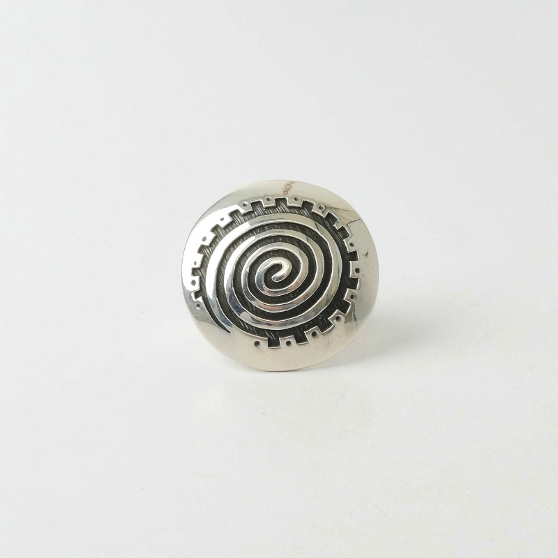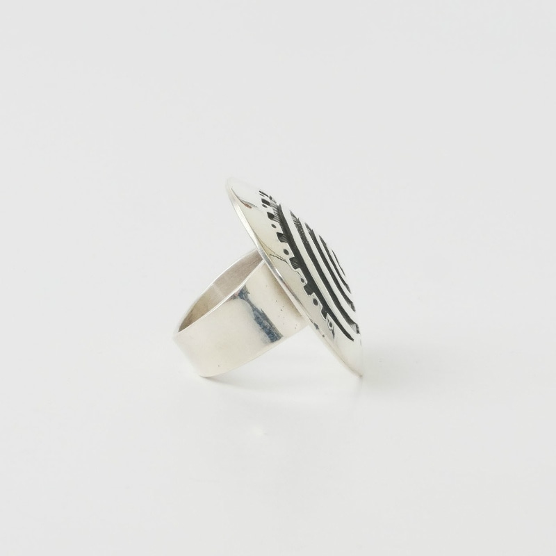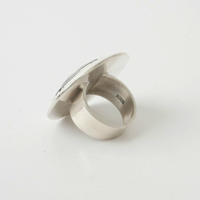 キーヤジー作・ペトログリフデザインのビッグトップリングです。渦巻きのデザインはマイグレーションと呼ばれる「移動・移住」を意味するモチーフで、古いペトログリフ(岩絵)によく描かれているもの。それを大胆にオーバーレイで描き出し、ビッグトップの個性派リングに仕立てています。