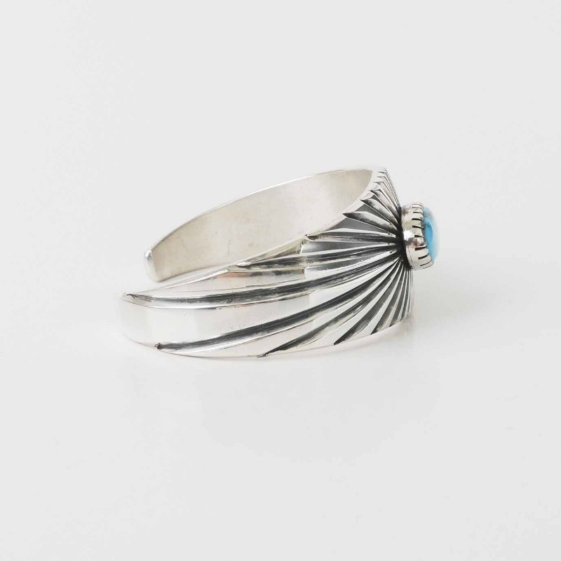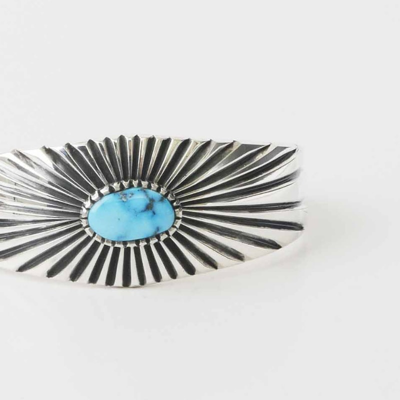 1952年生まれ。ナバホの母とアイリッシュの父を持つ彼は、ナバホリザベーションで育ちました。ナバホの習慣の元で育った彼は、シルバースミスであった祖父の影響でジュエリー製作を始めました。高校ではJesse MonongyaやTommy Jacksonらのジュエリー製作のクラスをとり、そこで本格的に学んだそうです。なので彼の作品は精巧なインレイワークから大胆なナバホのオールドスタイルまでと幅広いです。赤土の大きな山の近くに、彼の工房とするホーガンはあります。時にロック、時にクラシック、音楽を聴きながら作られる彼の作品は、シンプルながら細部までこだわりが感じられ、正確なスタンプワークと類をみないボリューム感が一目で彼の作品だと主張しています。恰幅のいい体つきと優しい笑顔、彼からはシルバースミスとしての確固たる誇りを感じます。