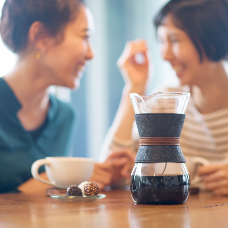 革とフェルトがおしゃれなデザイン。円すい型のドリッパーを合わせて使えば、そのままおいしいコーヒーを入れられる。家族や友人とシェアできる大容量。フルーツたっぷりのデトックスティーなどにもおすすめ。