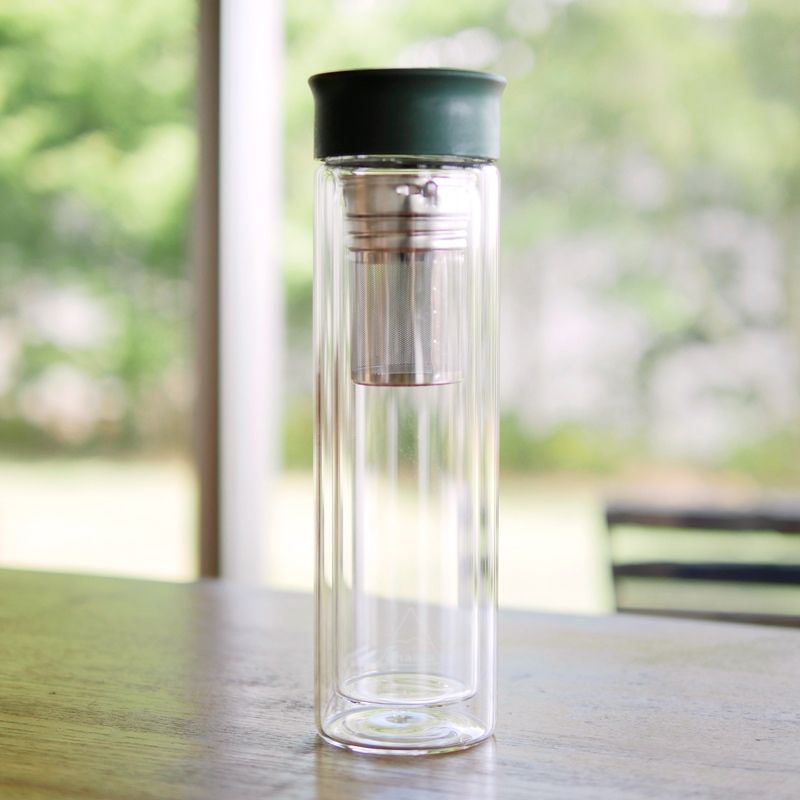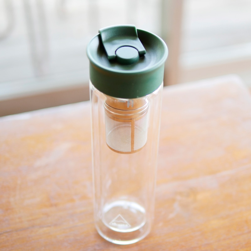 カジュアルなデザインのボトル。夜、ステンレスフィルターにコーヒー粉を入れ、水を注いで冷蔵庫で冷やしておけば、朝にはおいしく飲める。他にもハーブティーなどにもおすすめ。COLD・HOTどちらにも対応。ガラスが二重構造だから、HOTを入れた時に熱さを感じず持つことができる。飲み口が付いているからそのまま飲んだり、グラスに注ぐことができるのもポイント。