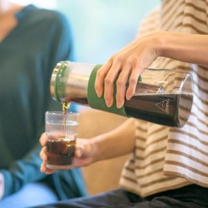 カジュアルなデザインのコーヒーポット。夜、ステンレスフィルターにコーヒー粉を入れ、水を注いで冷蔵庫で冷やしておけば、朝にはおいしく飲める。他にもハーブティーなどにもおすすめ。COLD・HOTどちらにも対応。1300mlの大容量だから、家族や友人とシェアできるのがポイント。シリコン部分を持つと滑りにくく、熱さを感じない優れもの。