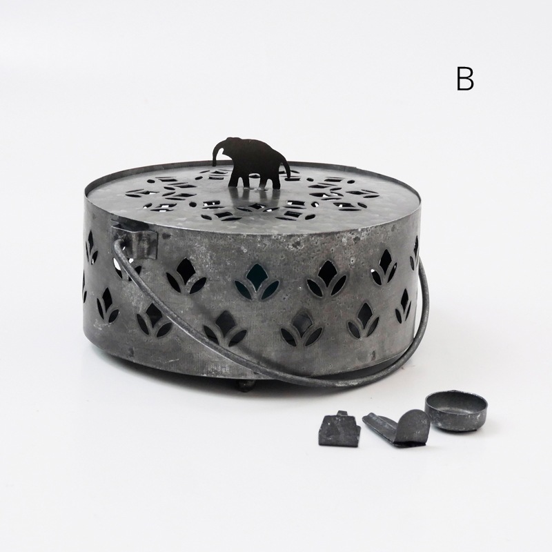 ブリキを使ったマルチ香立てです。3種類のホルダーが付いているのでコーン香やスティック香、蚊取り線香まですべて使える優れもの。屋外に持ち出せるよう取っ手も付いてます。蓋の上のモチーフは猫・象のモチーフの2種類がありますのでお好みで!これからのシーズン活躍してくれそうですね!