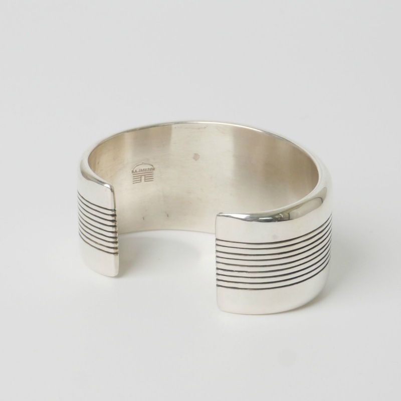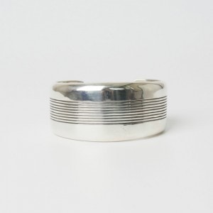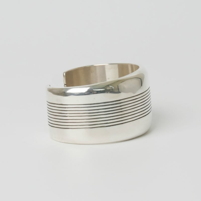 ダンジャクソンの幅広ラインバングルです。細いチゼルで正確に均等に刻まれた9本のライン、厚さ5mmのシルバーは中空とはいえ重厚な存在感。銀そのものの素材を堪能できるシンプルバングルです。