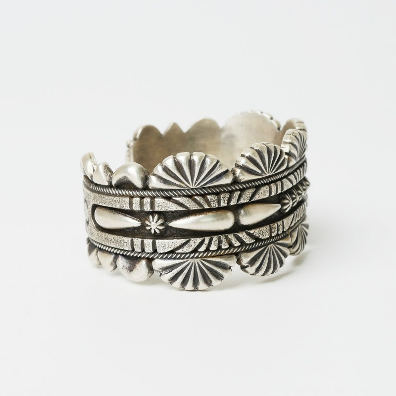 トーマスジムの重厚なバングルです。厚いところは銀板を3枚重ねにしている、4mm厚近いボリュームバングル。スタンプやバンプアウトで作られた伝統モチーフをぎっしりとアップリケしています。艶消しのマットな仕上げ。ウエスタンスピリットを感じる力強いジュエリー、ヴィンテージのような風合いで力強く包容力のある手元を演出します。