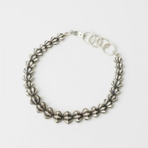 トーマスジムのハンドメイドビーズブレスレットです。一つ一つのパーツをバンプアウトで成形しロウ付け、その後やすりで丁寧に形を整えたハンドメイドシルバービーズを使用。サイズの違うシルバービーズを丁寧につないだ非常に時間のかかる伝統的な作品です。今では作る職人が少ないハンドメイドスタンプビーズ。シンプルな作りですが、量産品と比すとひと粒の仕上げの丁寧さが段違い、さすがシルバーワークの匠・トーマスジム。使い込んだ時に違いが出る、通な大人のためのジュエリー。