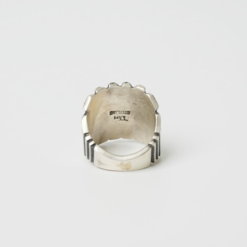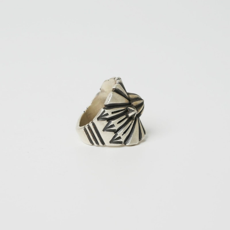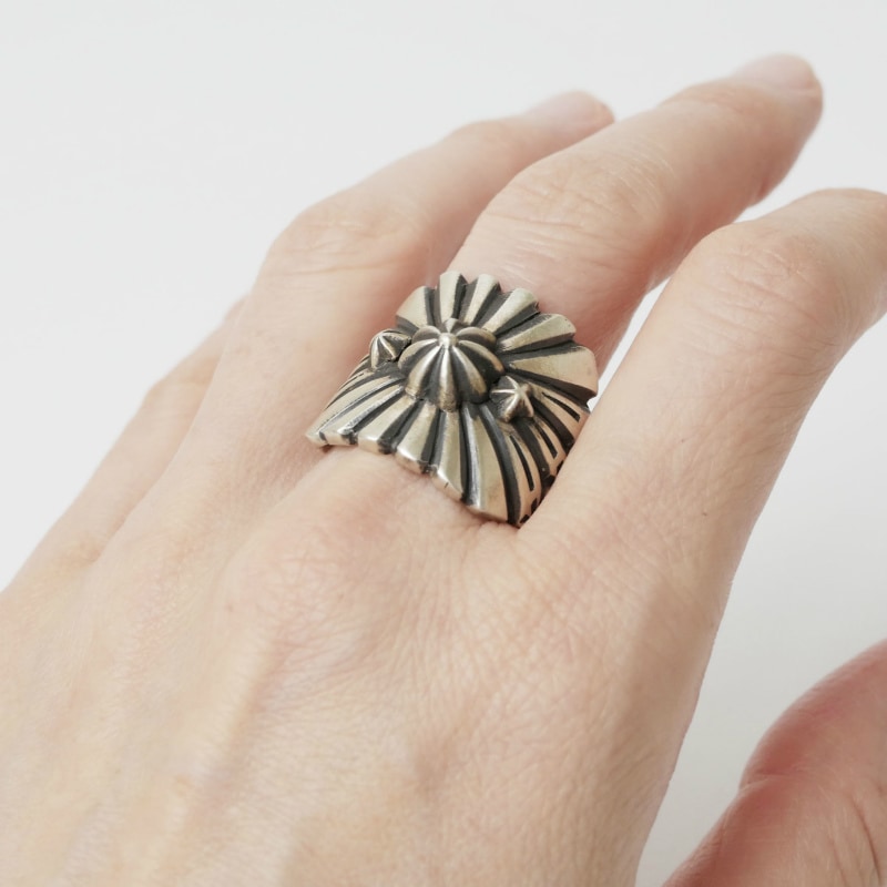 トーマスジムのスタンプワークリングです。ヘヴィーゲージの艶消しシルバーに深く力強いサンバーストのライン、中心にロゼッタコンチョを配した力強いオールドスタイルジュエリー。重厚感たっぷりですが、エッジは丁寧に整えられ背面はかなり細めにテーパーダウン、着用感の良い仕立て。気軽に長く付き合えるリングになっています。