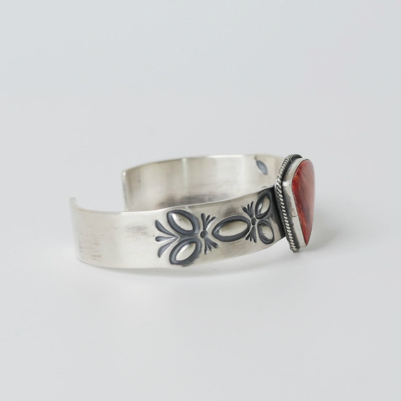 アンディキャドマンのモレンシターコイズバングルです。朱赤のスパイニーオイスターを使用、貝ならではの縞がナチュラルな雰囲気。アンディらしいフットボールスタンプのバンプアウトが散らされたシンプルなオールドスタイル、シルバーの厚みも程よく、サウスウエストらしいジュエリーに仕上がっています。