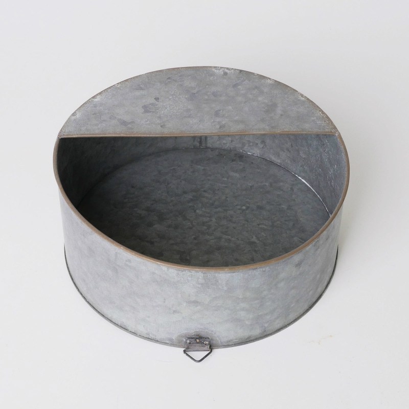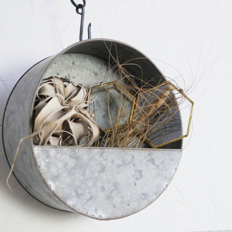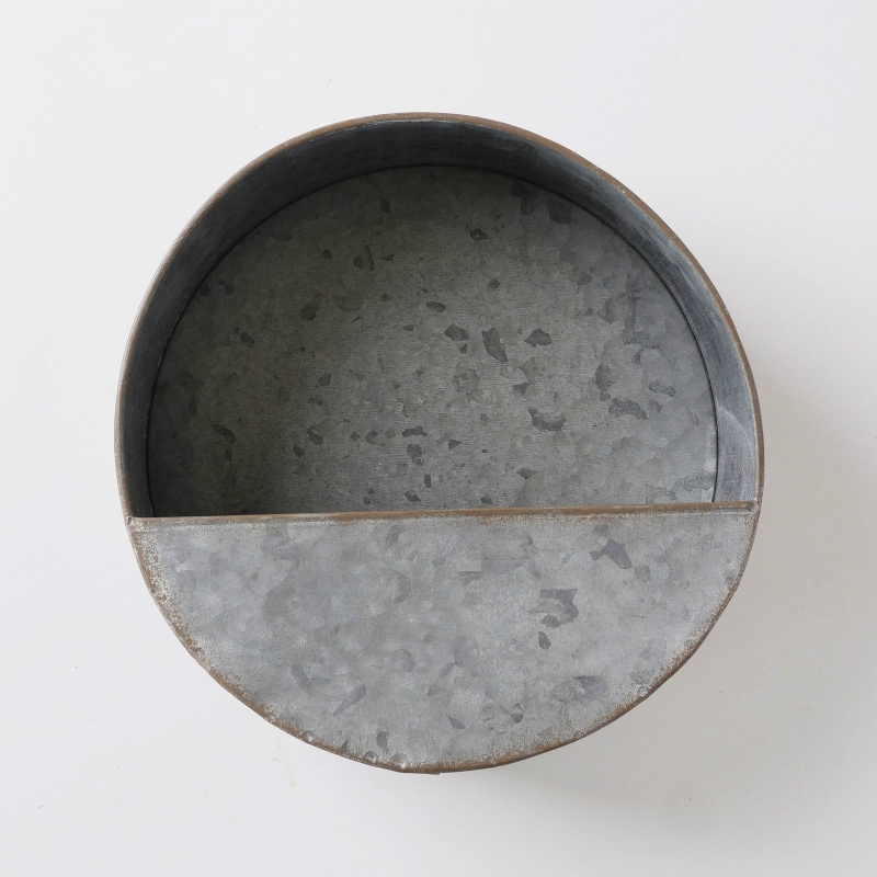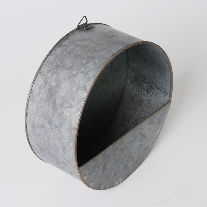 ブリキで出来たラウンドタイプの壁掛けバスケットです。屋内では壁にかけてドライフラワーやグラスを飾ったり、屋外でも植木鉢としてなど、色々楽しめそうです。