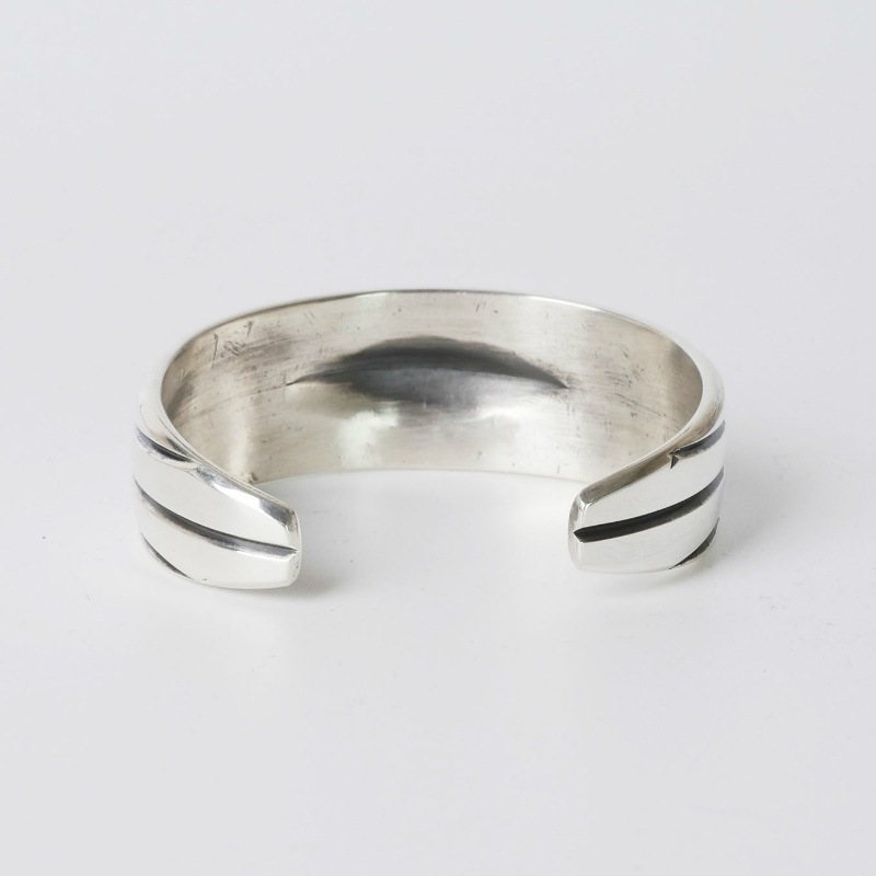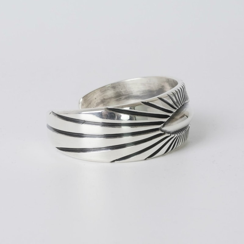 ハリソンジムのスタンプワークバングルです。ヘヴィなインゴットシルバーを艶やかな鏡面仕上げで緩やかなドーム状に仕立て、中心にはフットボール型のリポウズ。緩やかなカーブと深く強いサンバーストの線も相まって錯視をおこし、実際よりも中心部がぐっとこちらに迫って見えます。シンプルですが味わい深く、経年変化も楽しみな長く愛せるジュエリーです。