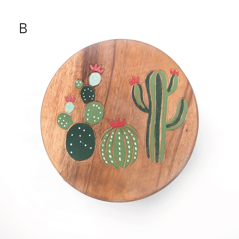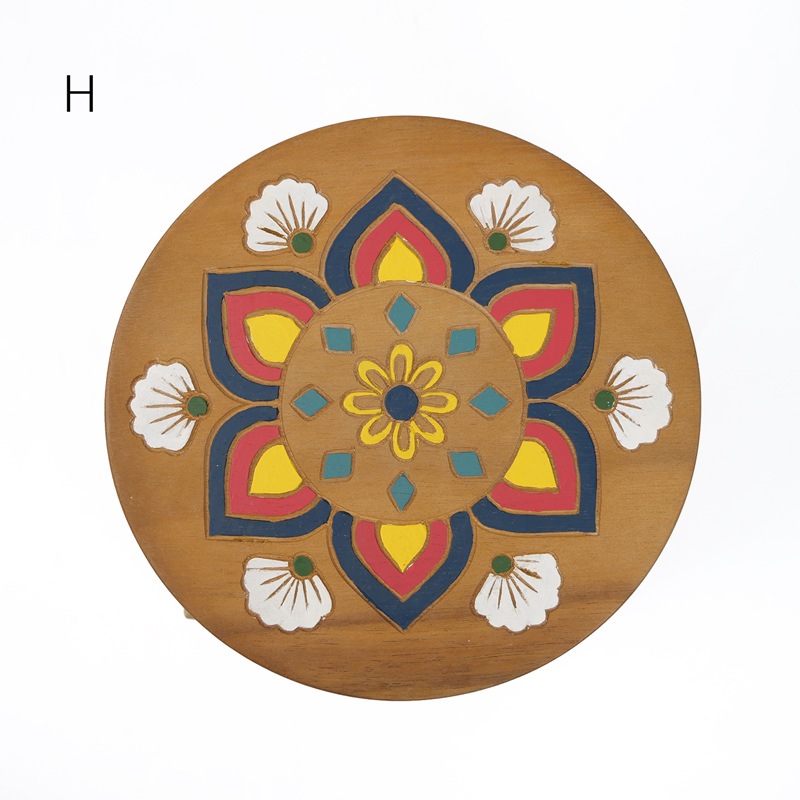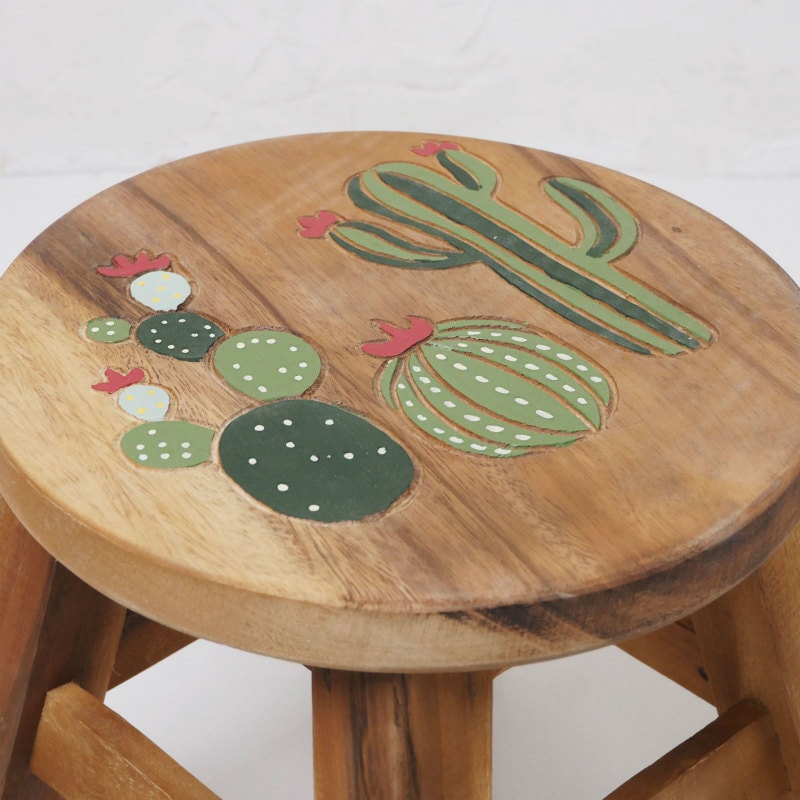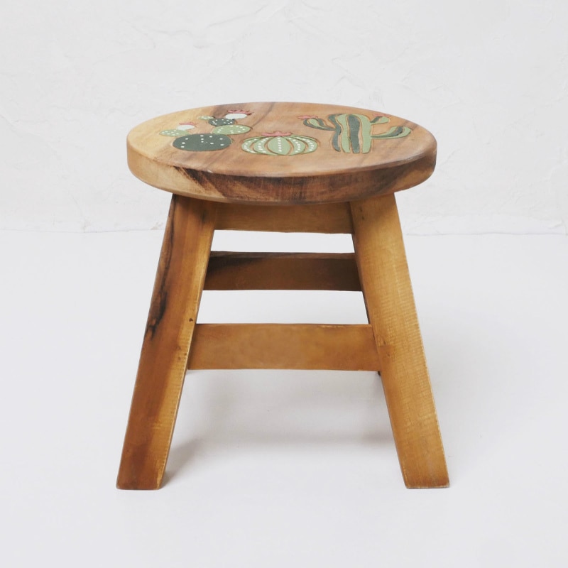 座面に彫られたポップで立体的な柄に、可愛くペイントされたラウンドウッドスツール。天然素材の風合いを生かしたハンドメイドアイテム。 子供イスとしてや、観葉植物などを置いてインテリアとして使ったりと幅広いシーン活躍しそう。
