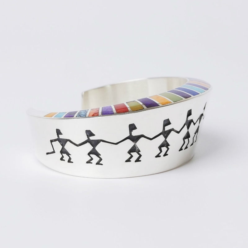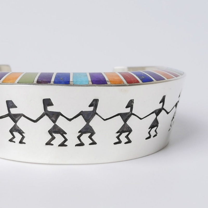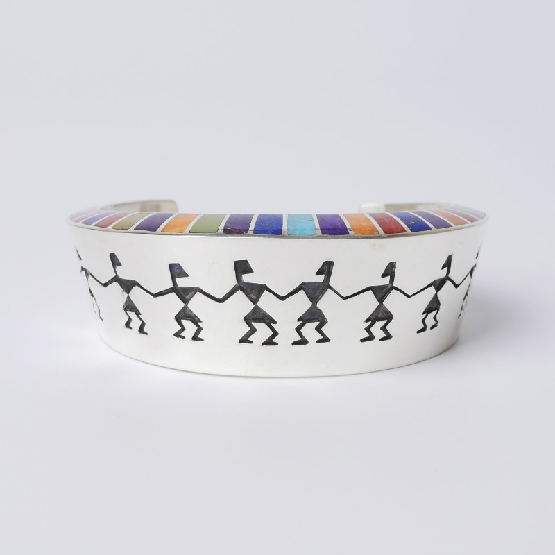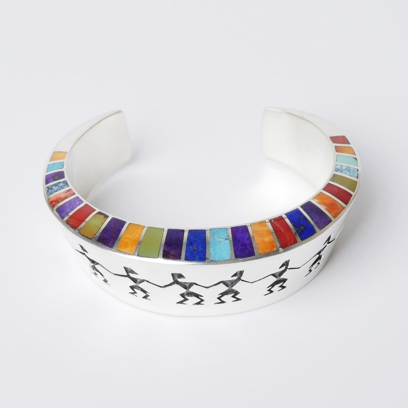ロンパーカーのインレイ×オーバーレイバングルです。少し幅広の中空バングルで、切り出されているのは古いペトログリフ(岩絵)に描かれているヒューマンのモチーフ。エッジには色鮮やかなマルチカラーインレイが。ボリュームがあり圧倒的な存在感ながら、着け心地はなめらかで軽い。サイズ変更が出来ないデザインの為、ぴったりあったならそれは運命の1点。