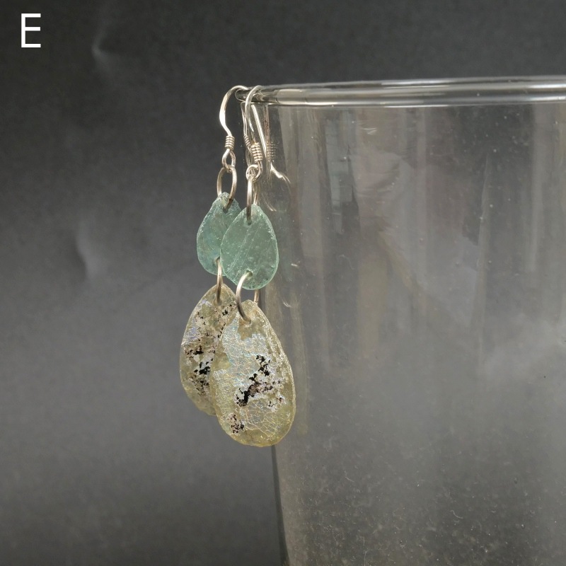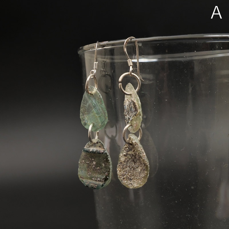 薄手のローマングラスをドロップ型のパーツに仕立て、2つ連ねた上品なピアス。遺跡から発掘される古代ローマ帝国期のガラスをラフに研磨したパーツを使用、長く土に埋もれていたガラスに現れる「銀化」が見て取れるものも多く、現代ガラスにはない味わいがある大人のアクセサリー。