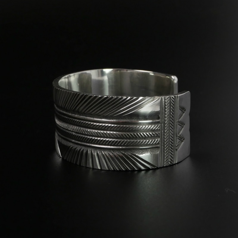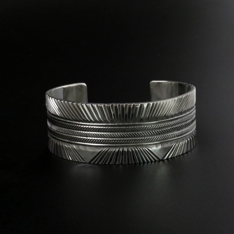 ロンベドニーのチゼルワークバングルです。エッジまで深く彫られたサンバーストと精緻なチゼルワークが美しい重厚な作品。繊細な線と陰影のみで仕上げられ、シンプルがゆえにロンベドニーの技量を強く感じられるデザインです。上下のサンバーストに変化をつけているのが珍しい1点。