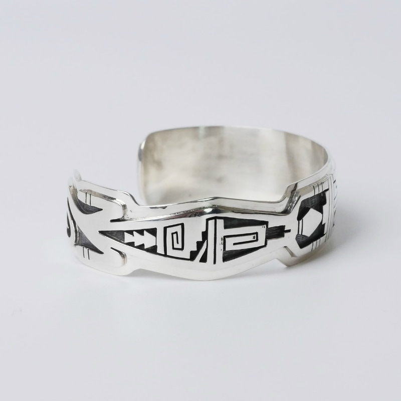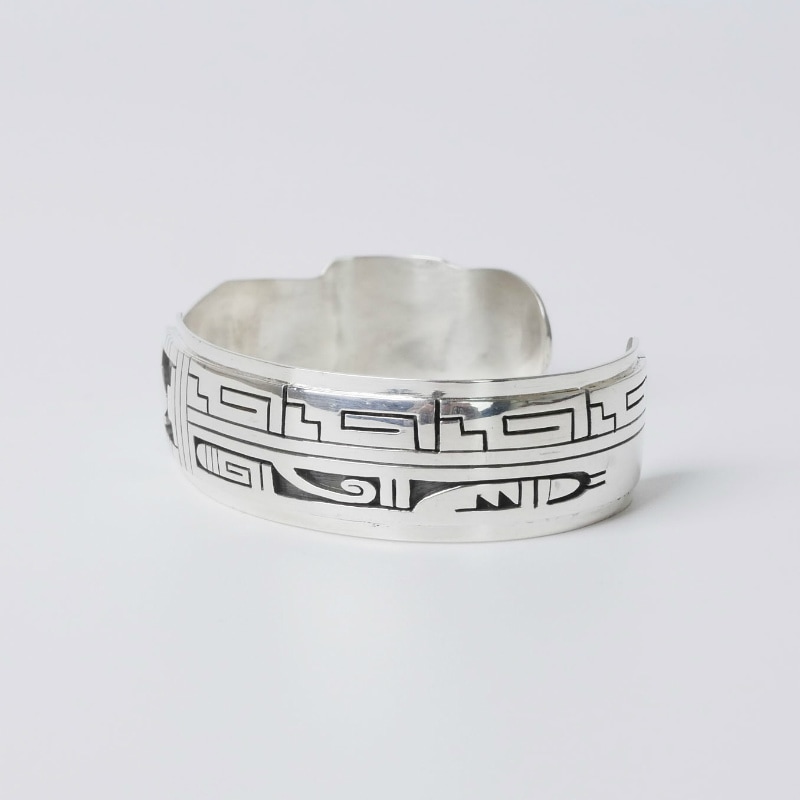 ベラ・タワホングバの、繊細なカットワークが美しいバングルです。右には様々な水の流れが、左には速さや知性を象徴するトカゲが配された作品。カッティングの技量とデザインセンスを兼ね備えたベラならではのジュエリーです。モチーフ部分でカットアウトされた鏡面磨きのエッジは緩やかな流線型を描き、素朴なホピオーバーレイにエレガントさをプラスすることに成功しています。