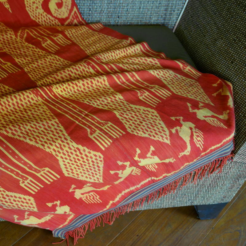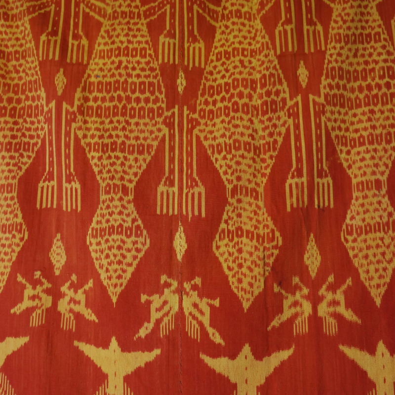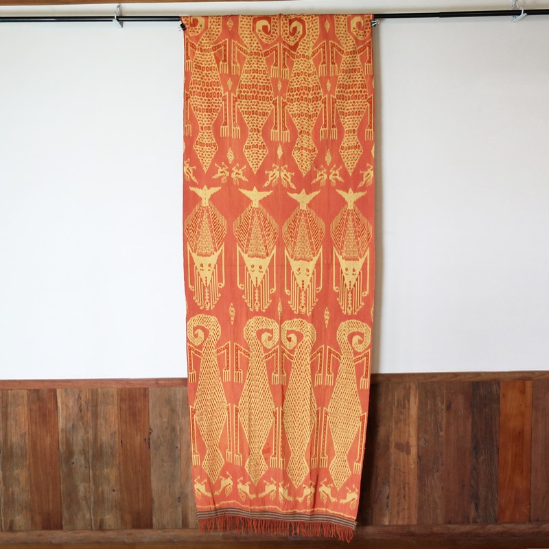 スンバ島東部各地で作られてきた男性用の腰布または肩掛け布で、他のどのイカットとも異なるダイナミックな絵柄が最大の特徴です。描かれる模様は、身近な動物からアニミズムにより生み出された空想動物まで様々で、それぞれに意味が込められています。子孫繁栄や生命力の強さ、戦いでの勝利などの願いを込めて作られた一点ものです。一対で織られた布を縫い合わせ、両端にカバキルと呼ばれるエンドボーダーを織り込んで一枚布に仕上げていることもスンバイカットの特徴の一つ。(カバキルが無いものもあります)
