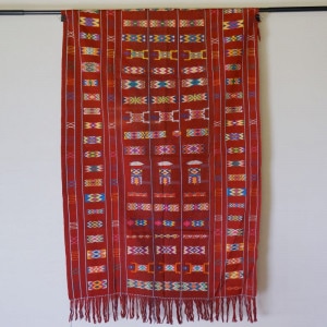 インドネシアのティモール島、西ティモール各地伝統の手織り布で、腰衣や肩掛け布として着用するものです。刺繍のように見える部分は、経糸に別の糸を絡めながら織り込んで表現している織り模様で、柄が繊細であればあるほど手間も時間も掛かる技法です。また同じ西ティモールでも地域、民族によって織り込まれる模様や色合いは異なり、中にはイカットと組み合わせて作られるものもあります。