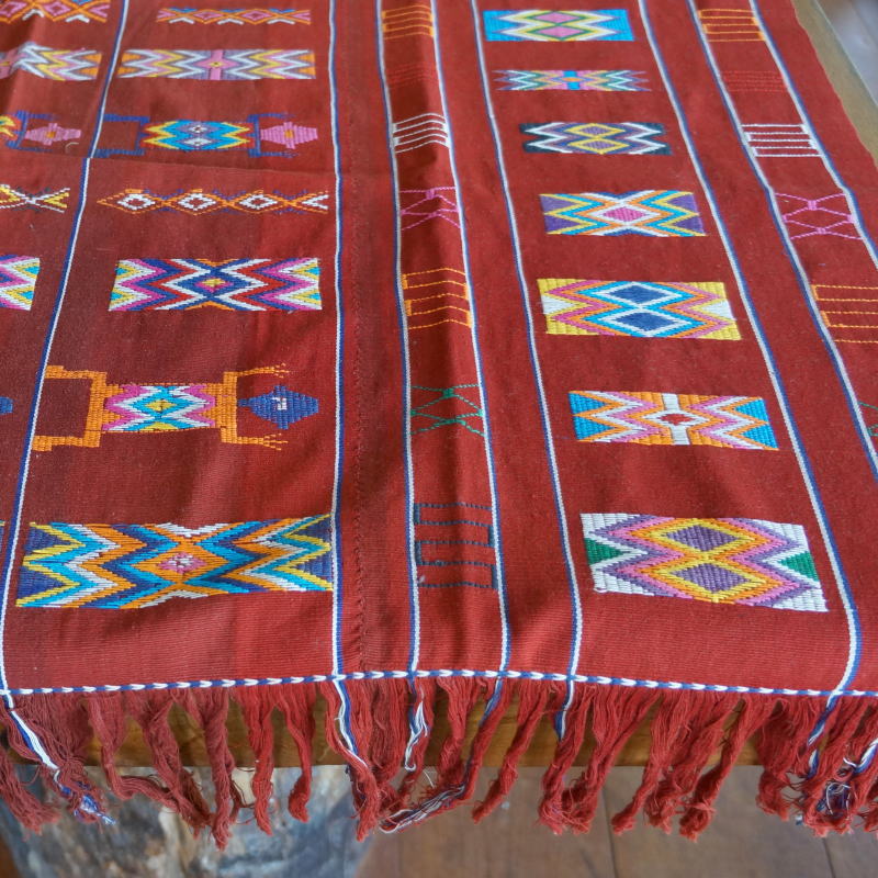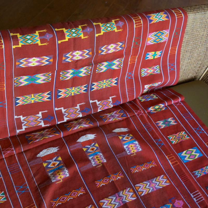 赤い布にカラフルな模様が美しい、ティモールの縫取織布です。刺繍のように見えますが、色の糸を縫い取りながら織った、非常に手の込んだ布です。