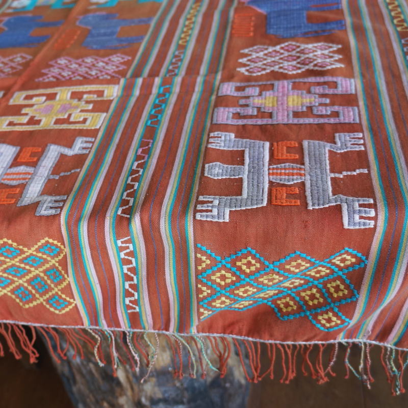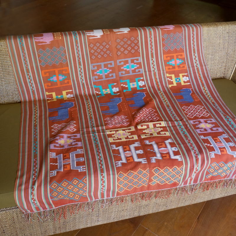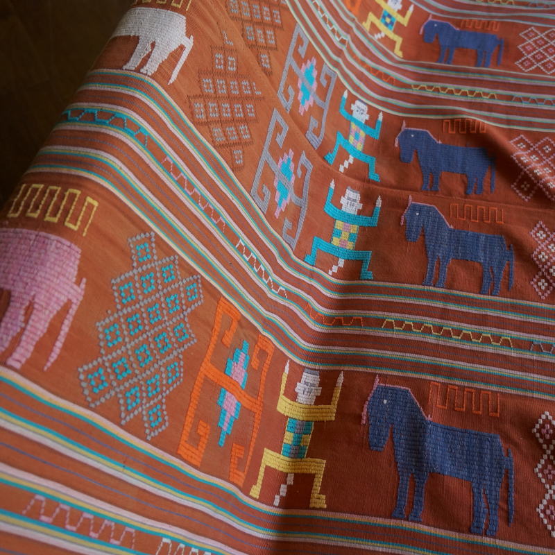 オレンジがかった布にカラフルな模様が入った、ティモールの縫取織布です。プリミティブな模様がどこかコミカルで可愛らしい。刺繍のように見えますが、色の糸を縫い取りながら織った、非常に手の込んだ布です。