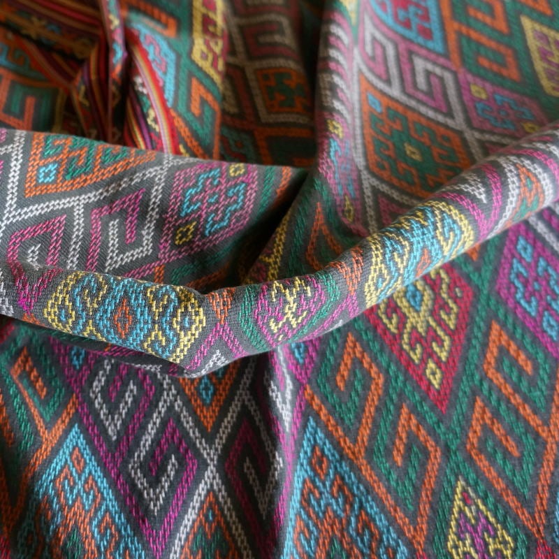 グリーンをベースにカラフルな模様が美しい、ティモールの縫取織布です。刺繍のように見えますが、色の糸を縫い取りながら織った、非常に手の込んだ布です。
