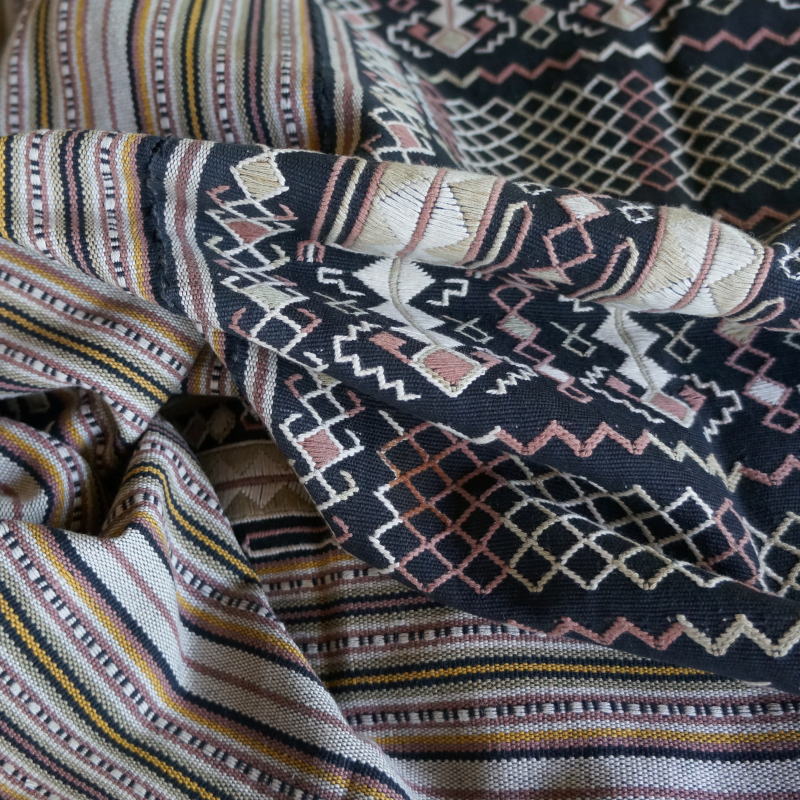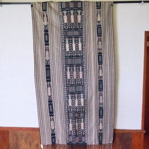 インドネシアのティモール島、西ティモール各地伝統の手織り布で、腰衣や肩掛け布として着用するものです。刺繍のように見える部分は、経糸に別の糸を絡めながら織り込んで表現している織り模様で、柄が繊細であればあるほど手間も時間も掛かる技法です。また同じ西ティモールでも地域、民族によって織り込まれる模様や色合いは異なり、中にはイカットと組み合わせて作られるものもあります。