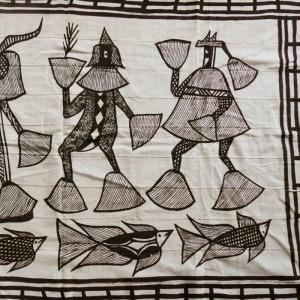ざっくりとしたコットン布をキャンバスにして、セヌフォ民族の職人が一枚一枚手描きで描いた絵布。独特の仮面と衣装を纏ったセヌフォのダンサーと魚が描かれています。おしゃべりに夢中になっている一人をホロホロ鳥と魚がこっそり見ているようにも見える、楽しい1枚。