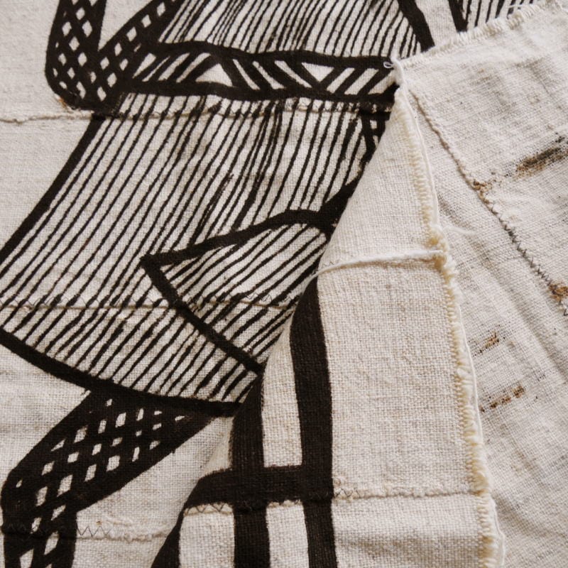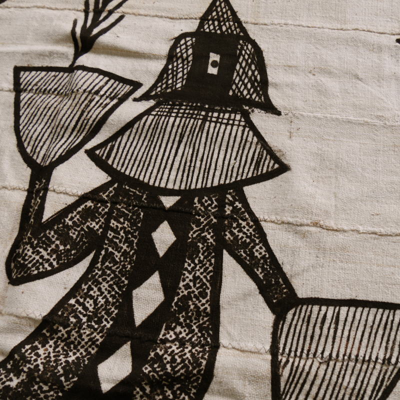 コートジボワール北部の町、コロゴで多く作られているため「コロゴ布」とも呼ばれています。手紡ぎのコットン糸を手織りで帯状に織り、それを何枚も縫い繋いで一枚の大きな布にしています。絵付けには「泥染め」の技法が用いられており、切り絵のような独特のタッチで描かれる様々なモチーフが印象的です。フリーハンドでの絵付けの為すべて一点物となっております。