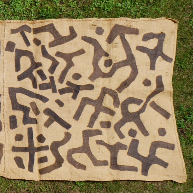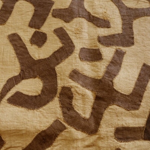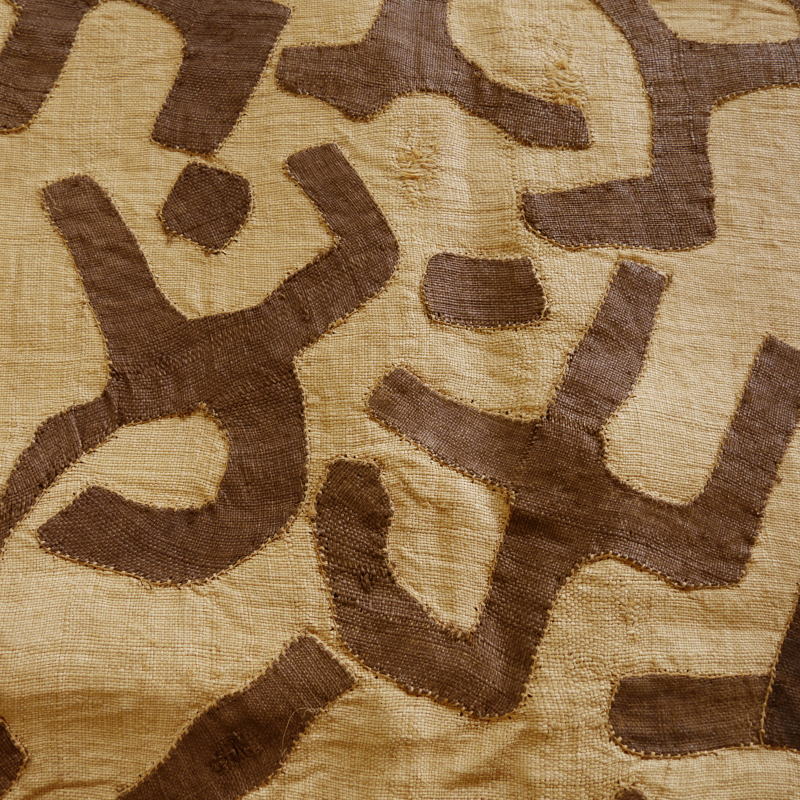 コンゴのクバ族のブショング族などが発展させたラフィアのアップリケ布。ラフィア椰子の若葉を干して裂いた繊維で男性が平織りの生地を織り、女性がその織り生地を濡らして棒でたたいたり、貝殻などでしごいて柔らかくします。これを 10 枚ほど横につなぎさらに幅の狭い布をその上側や下側につなぎ衣装として基本の形を作ります。その後女性が、モチーフとなる形をラフィアの布から切り取って、アップリケを施します。このアップリケは、生地をしごいた時に出来た穴を埋めるためにつぎあてをしたのが始まりとされています。