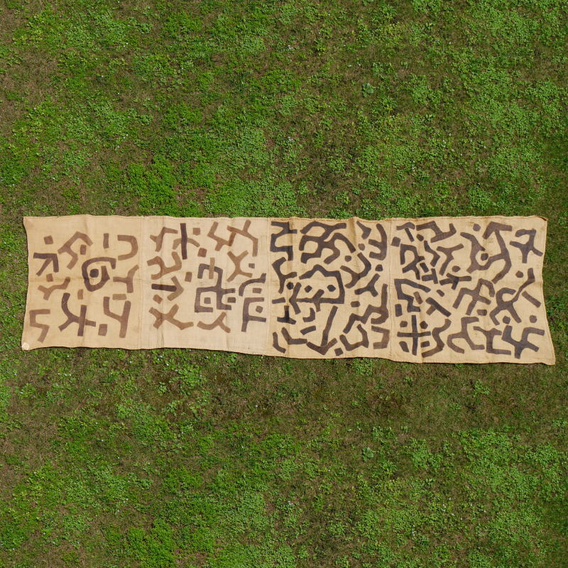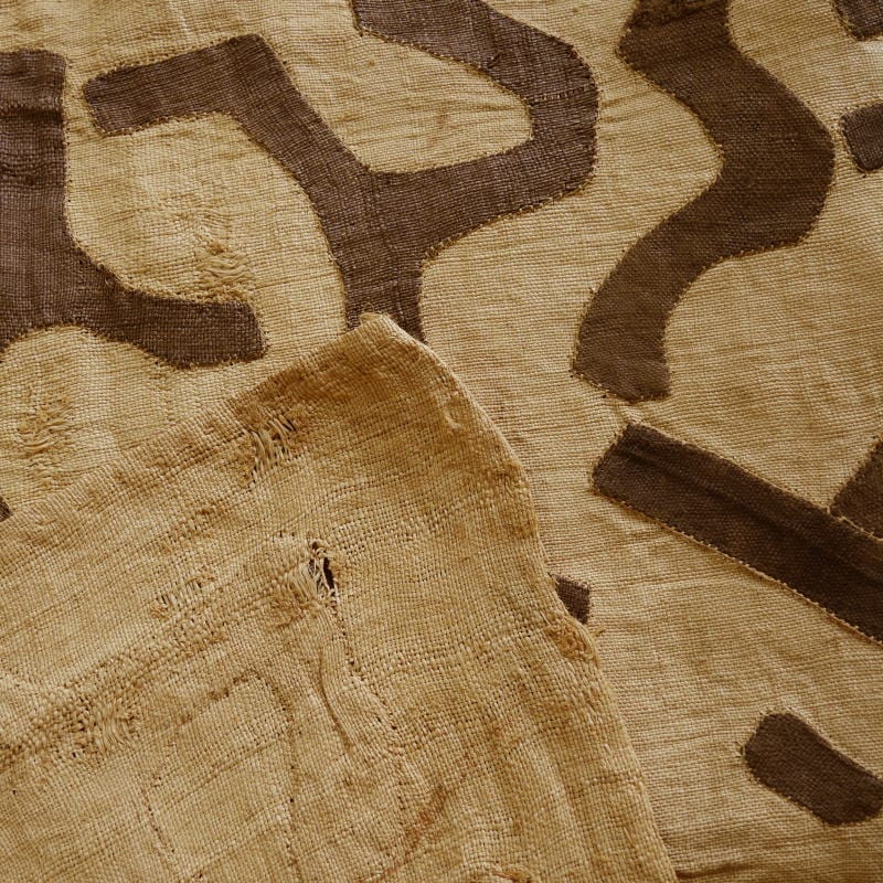 クバ族は王を含むブショング族を中心に約18の民族集団から成り、17世紀に成立した森とサバンナの王国です(現在のコンゴ民主共和国内)。クバ族の居住する地域では綿花が取れない為、伝統的にラフィア椰子の葉の繊維で作られた衣装が作られてきました。それらの衣装は、ブショング族などが作るアップリケや絞り染め、ショワ族の草ビロードなど、それぞれの民族が独自の技法とデザインを発展させ、現在も祭りや儀式の際に身に付けられています。