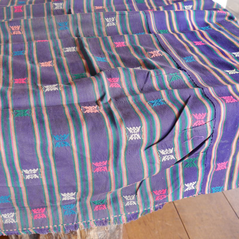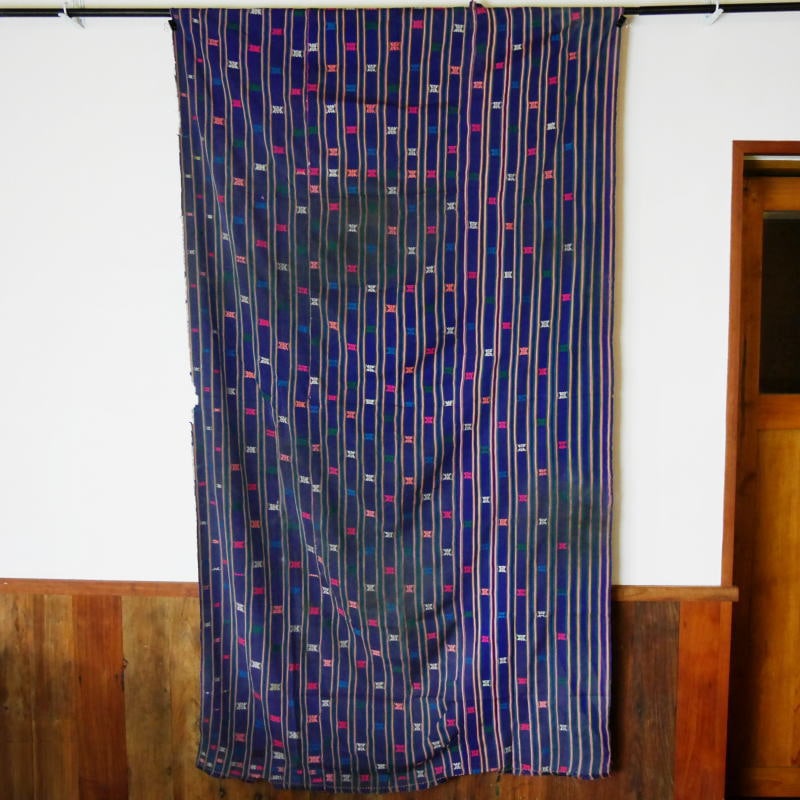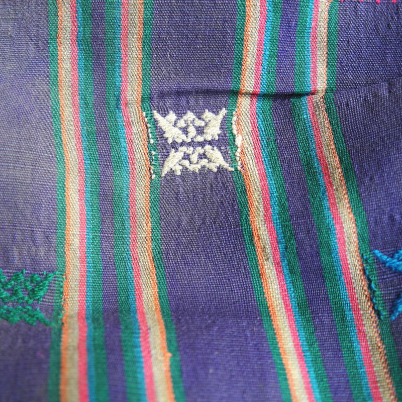 カラフルな糸を使用して織られた細かい模様が美しい1枚。刺繍のように見える模様は、縫取りながら織り、裏側も美しくなるよう、大変手間をかけた織物です。※実際にブータンの人々が使用していたアンティーク品につき、ダメージが多めのものとなっております。