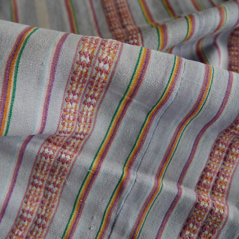 珍しい淡い色合いのブータン布。刺繍のように見える模様は、縫取りながら織り、裏側も美しくなるよう、大変手間をかけた織物です。