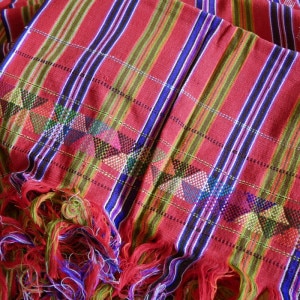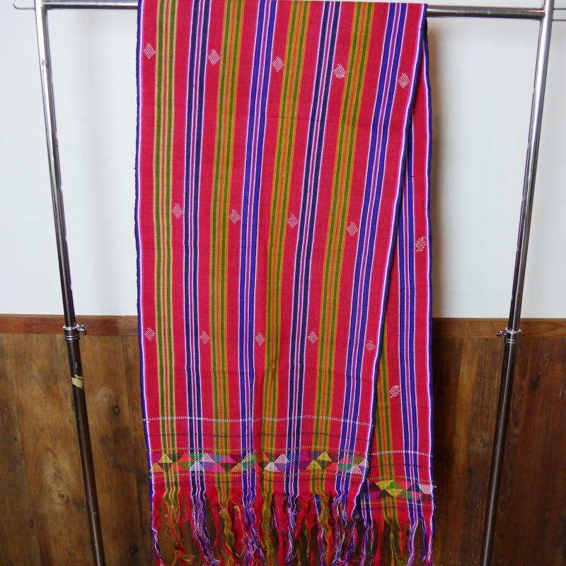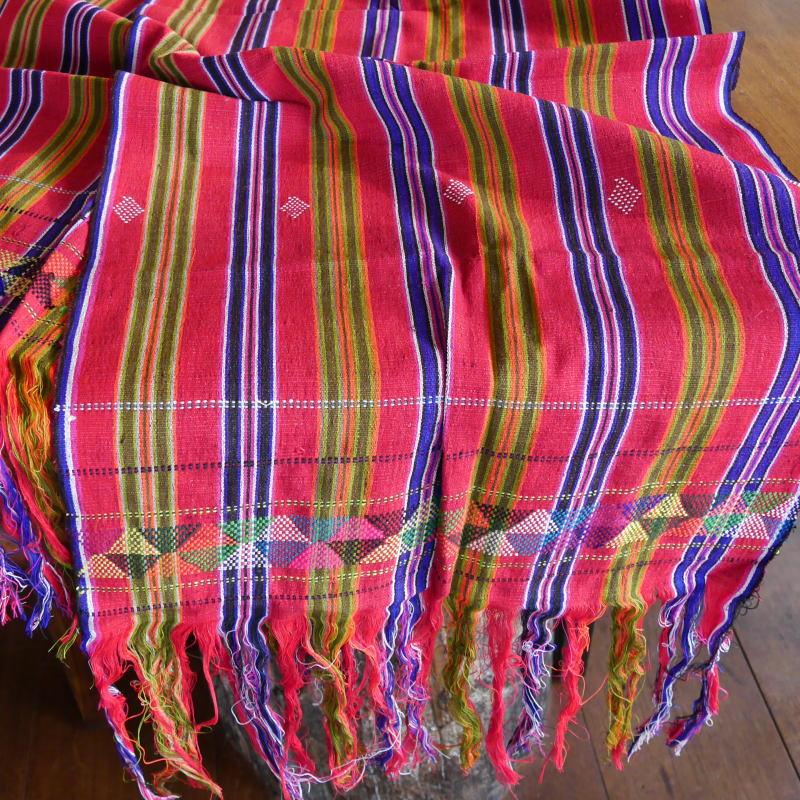 赤を基調とした華やかなストライプ織りが素敵な一枚。民族帯ですが、幅があるので様々な用途に使えそう。