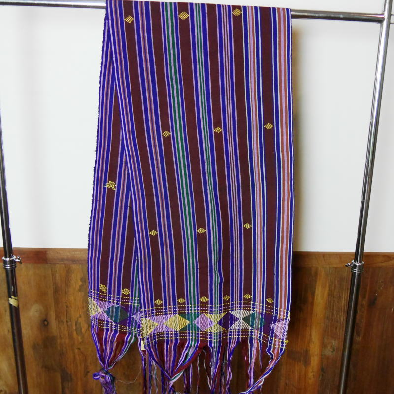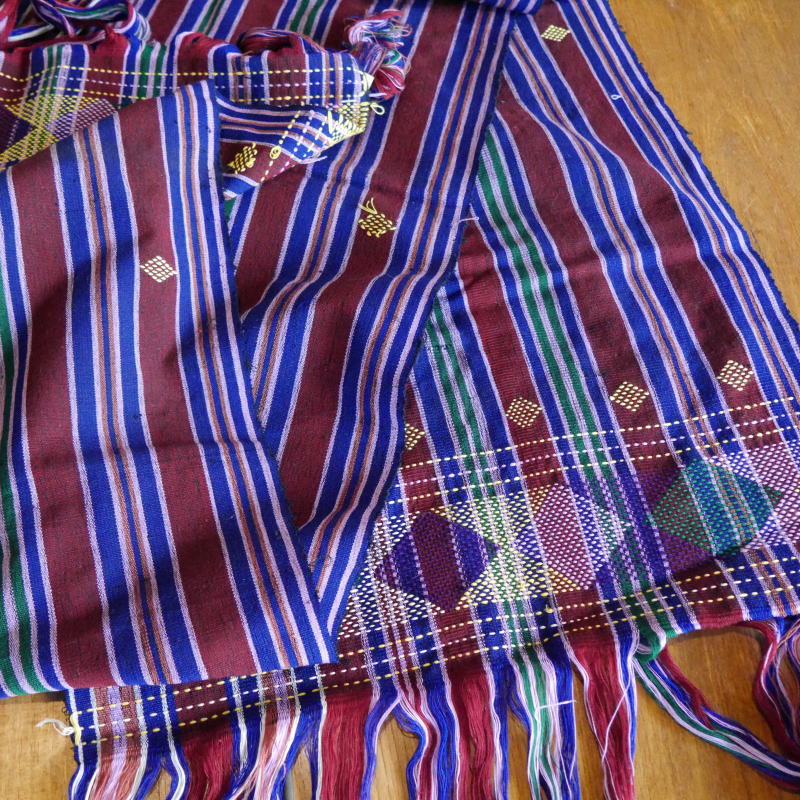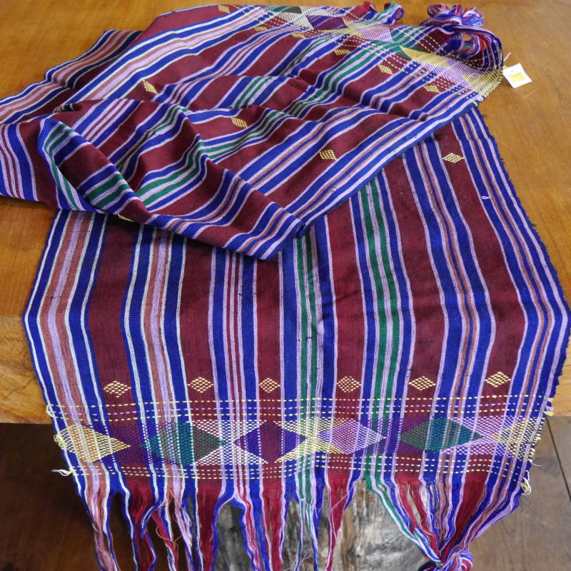 ブータンの女性用民族衣装で、正装の際に左肩から掛ける帯飾りです。お城(ゾン)へ入る時、高僧や高官に会う時など正式な場所へ出る際には、必ずこのラチューを付けます。10~20cm幅に織りや刺繍で模様が入っていて、両端はフリンジになっています。