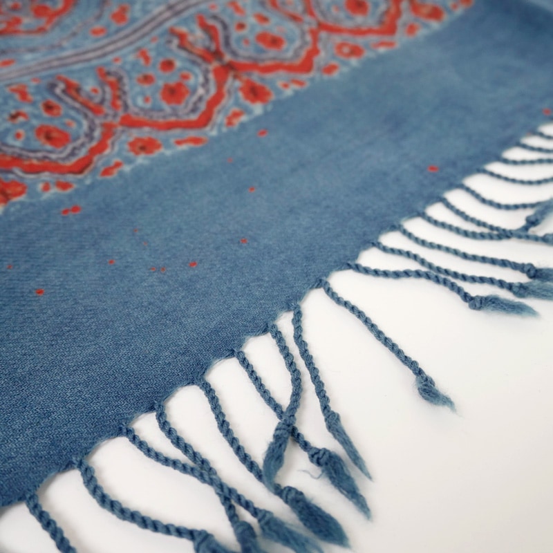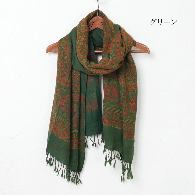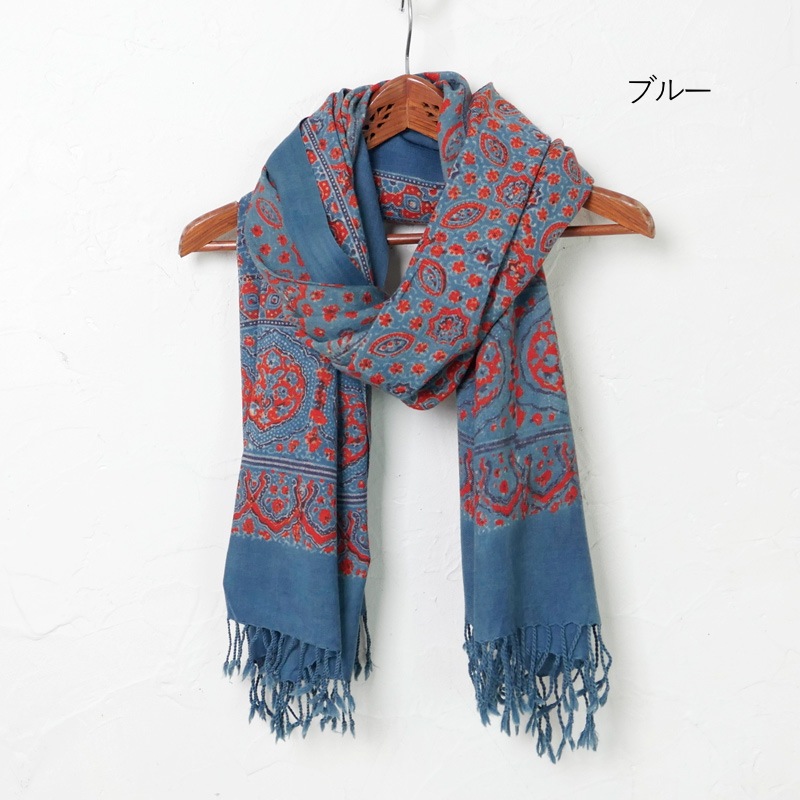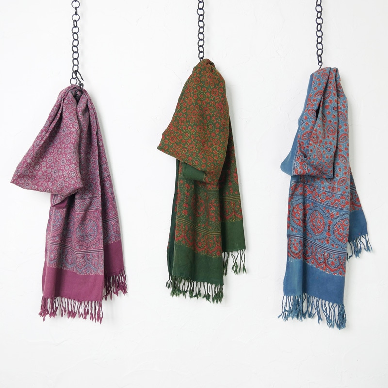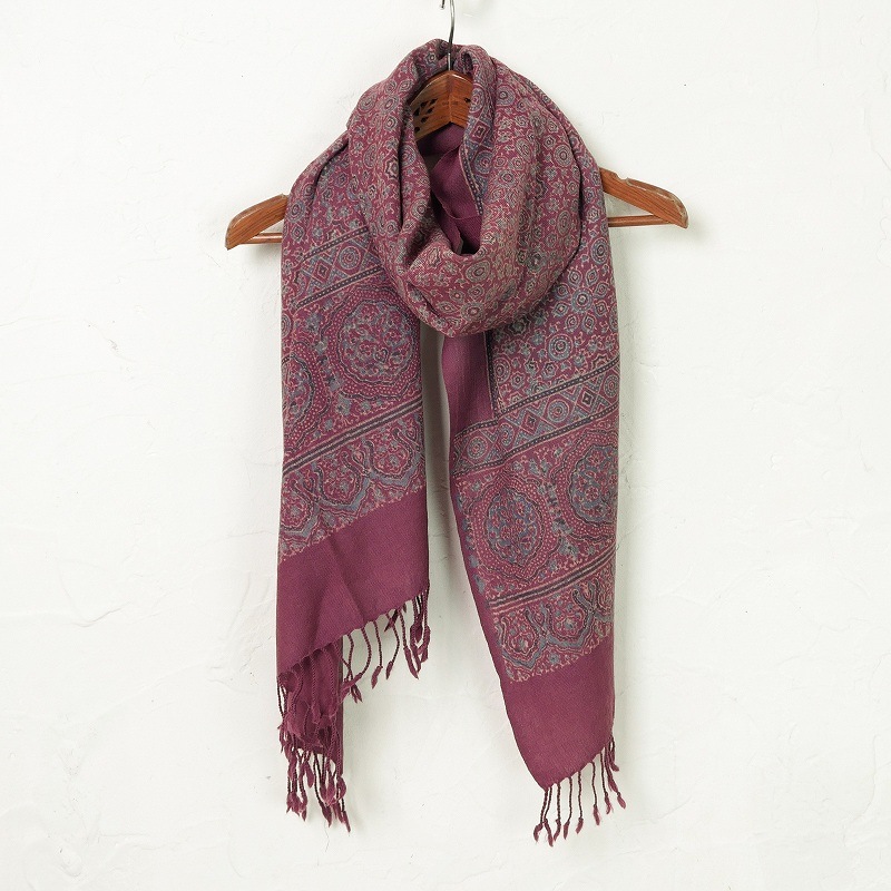 インド伝統のオリエンタルな雰囲気のアジャラクプリントを全体に施したストール。シンプルなスタイルにプラスしたいアイテム。ウール素材を使用しているから暖かく、これからの時期おすすめ。柔らかい生地で巻いた時に綺麗なフレア感が魅力です。