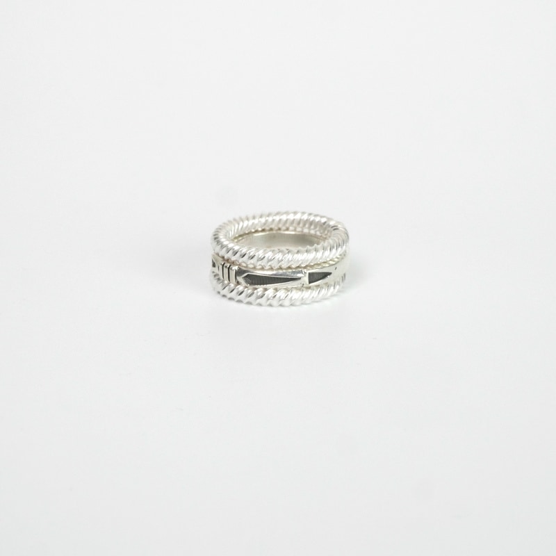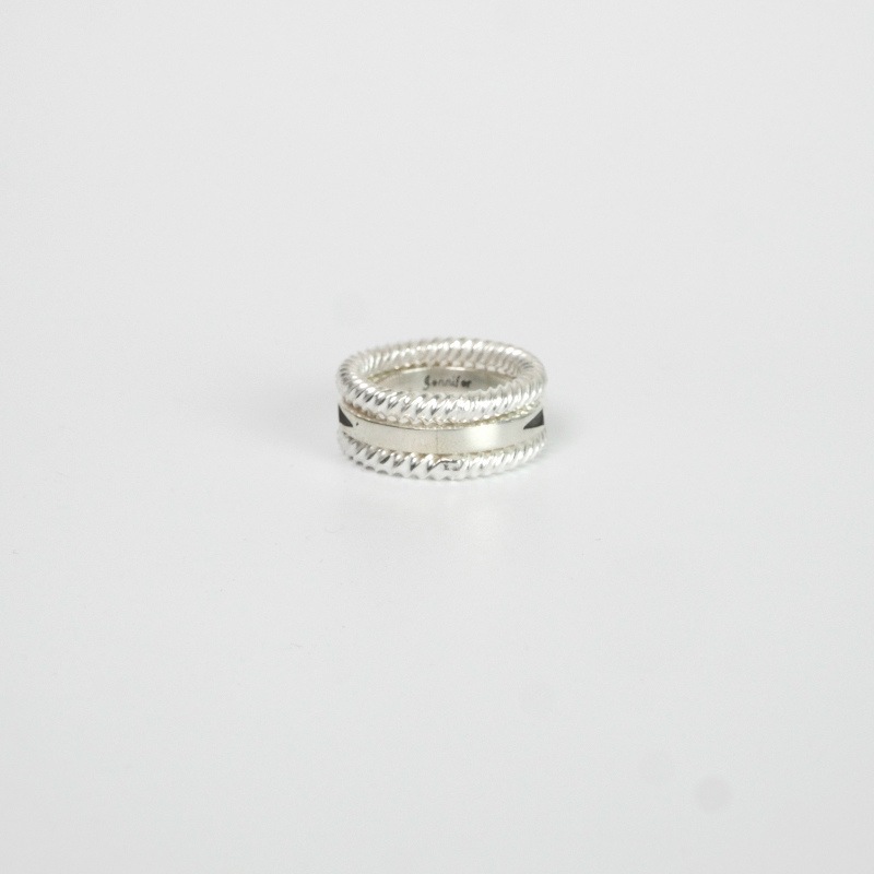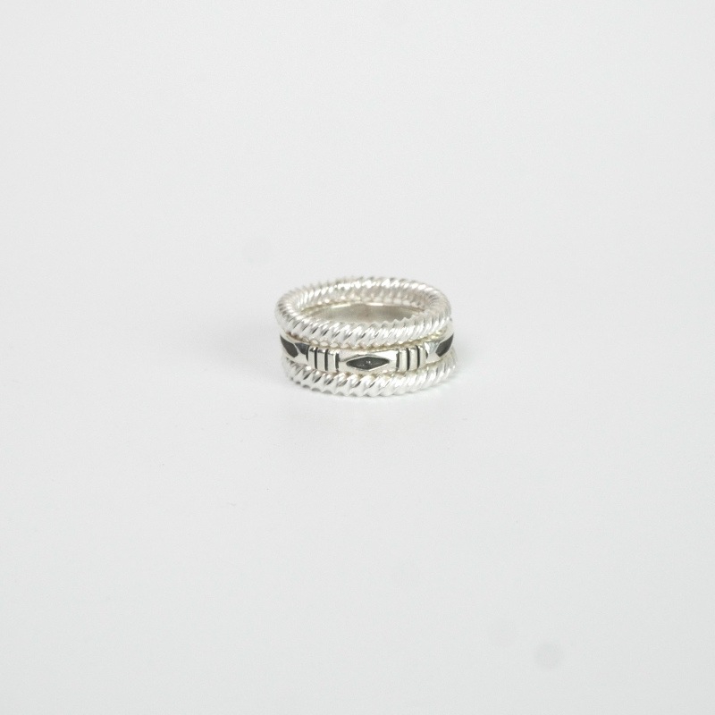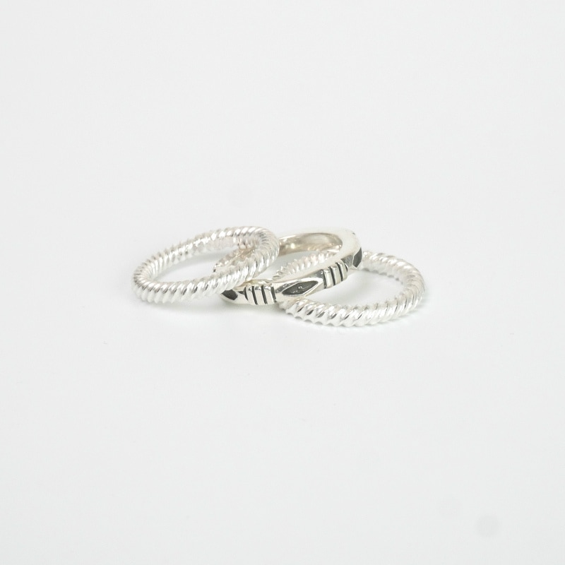 ジェニファー作品のマストアイテム、スクエアワイヤースタンプリングの3連スタックリングです。中心は立体感を持たせる細部の丁寧なやすりがけでシンプルなリングながら味わいのある1本、上下にシンプルなツイステッドが2本。1本で、重ねづけで、組合せを変えて、とコーディネートを楽しめる作品です。