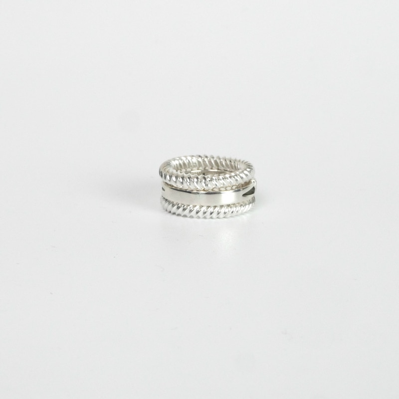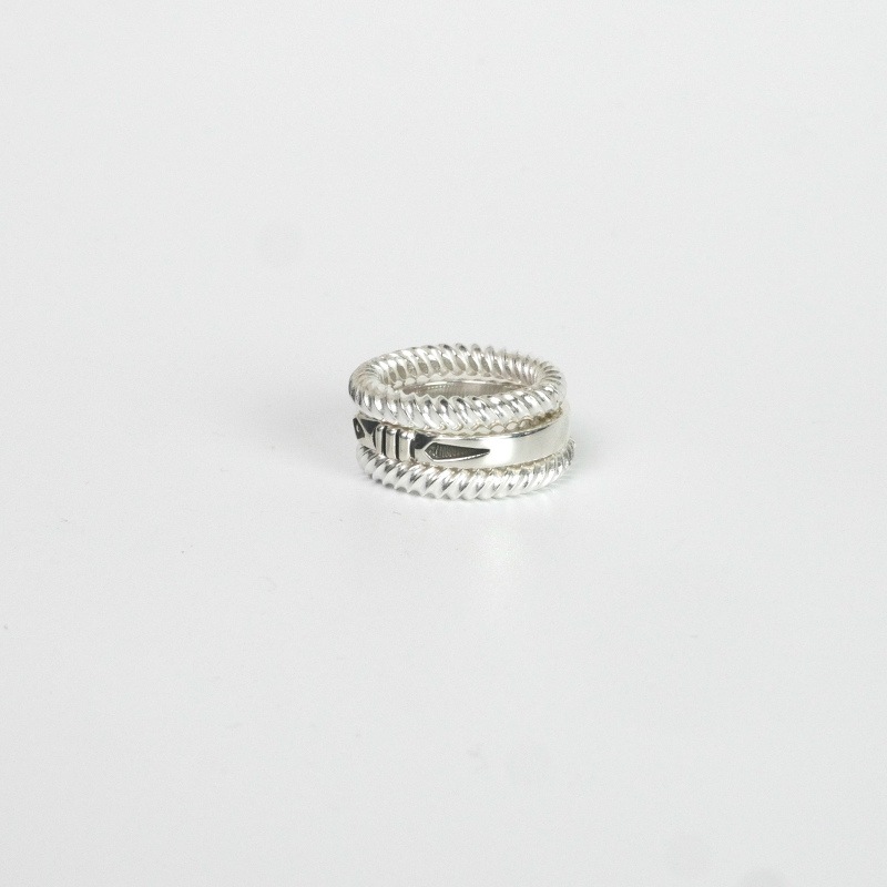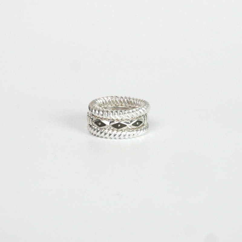 ジェニファー作品のマストアイテム、スクエアワイヤースタンプリングの3連スタックリングです。中心は立体感を持たせる細部の丁寧なやすりがけでシンプルなリングながら味わいのある1本、上下にシンプルなツイステッドが2本。1本で、重ねづけで、組合せを変えて、とコーディネートを楽しめる作品です。