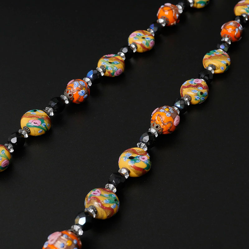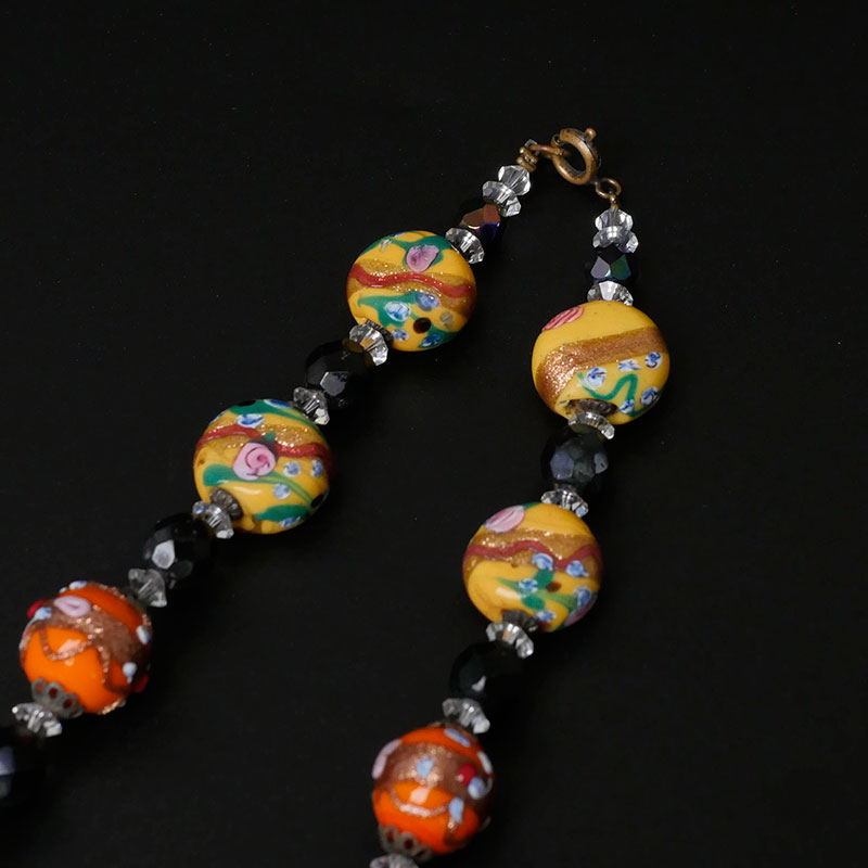 黄色・オレンジビーズのMIX。散りばめられた黒ビーズと、中央の赤ビーズがアクセント。金具付きなのですぐにご利用頂けます。