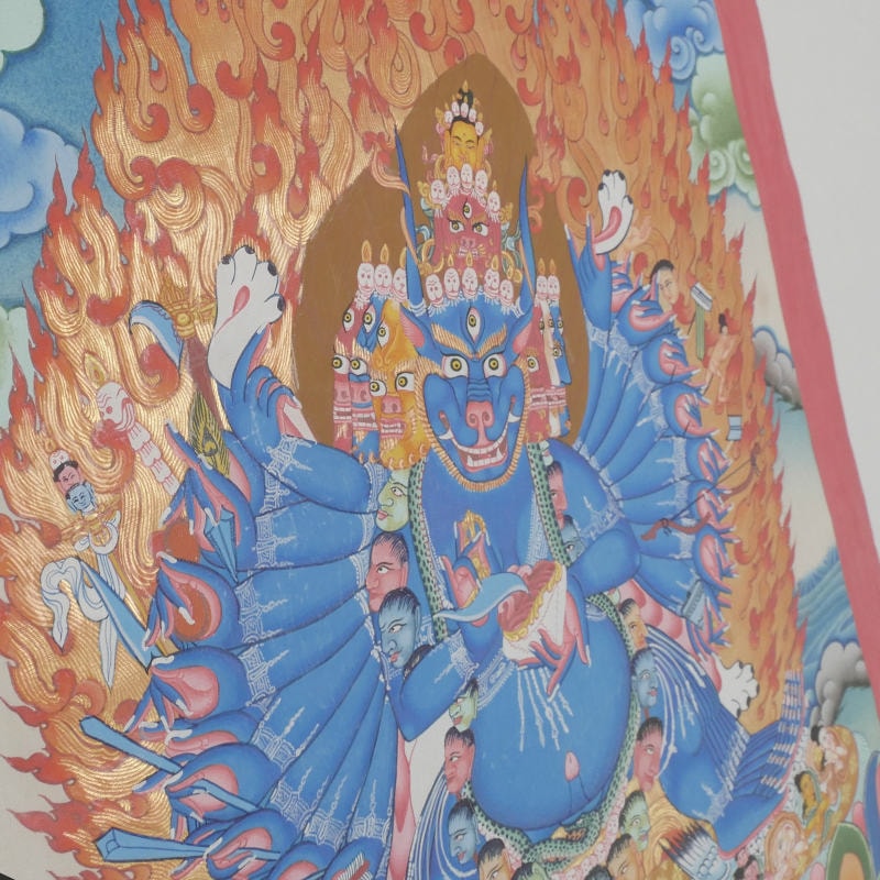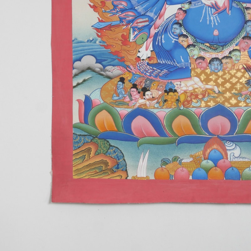 チベットの仏教美術として有名なタンカ。こちらはネパールで全て職人の手によって描かれた作品で、鮮やかな色彩と緻密な描き込みが見事。繊細な金彩がふんだんに施され華やかで荘厳な仕立てす。