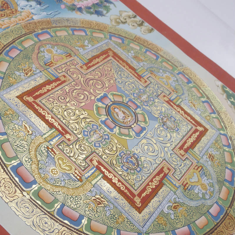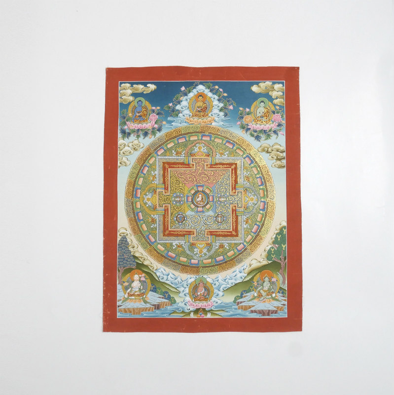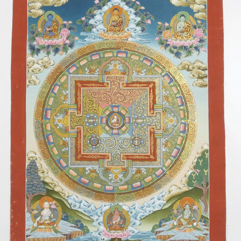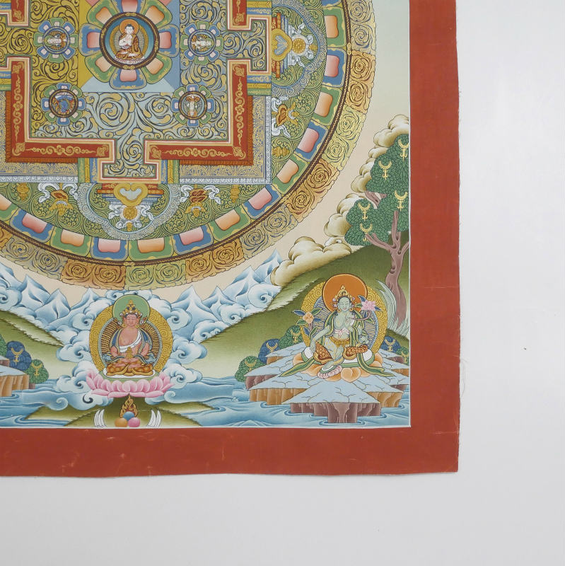 チベットの仏教美術として有名なタンカ。こちらはネパールで全て職人の手によって描かれた作品で、鮮やかな色彩と緻密な描き込みが見事。繊細な金彩がふんだんに施され華やかで荘厳な仕立てす。