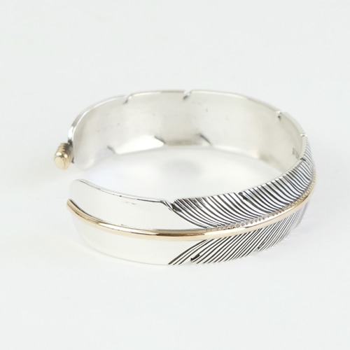 ハーヴィー・メイスのイーグルフェザーバングル、中幅の程よくボリュームのある1本です。中心には、12Kゴールドフィルドのラインが使われたツートーンになっています。細かい羽の一本一本までハンドメイドで刻まれています。ネイティブアメリカンにとってイーグルは神のメッセンジャーとされ、儀式の際にはイーグルフェザーは欠かせないアイテムです。お守りとして、ギフトにもオススメです。