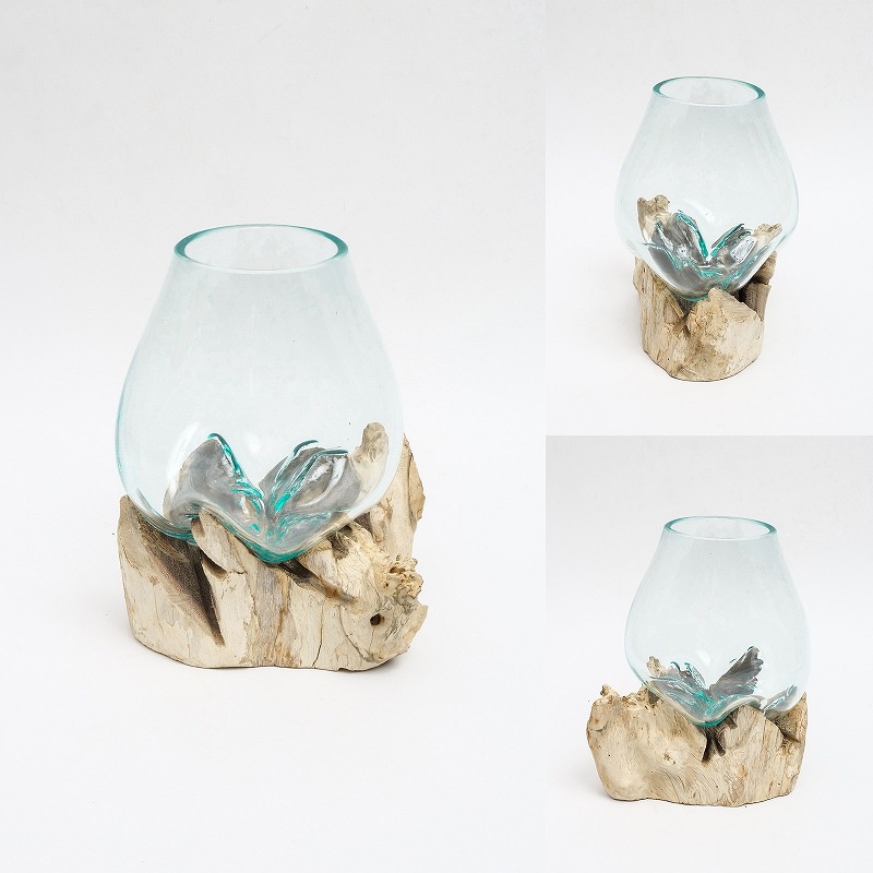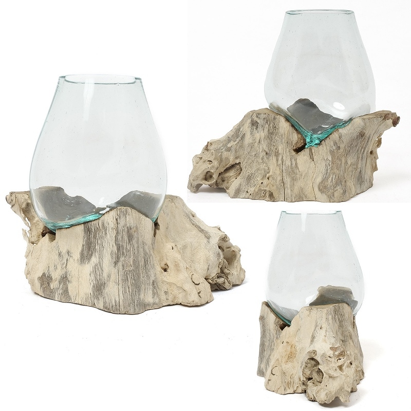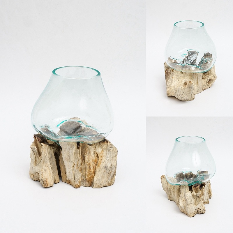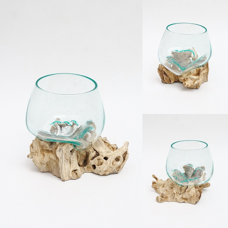 中くらいサイズのポット。ガラスが熱いうちに天然の流木に当て形を形成したポット。天然素材を活かしたナチュラルな雰囲気が魅力。テラリウムの他、金魚鉢やフラワーポット、サボテン鉢などにもできる。自分だけのオリジナルテラリウムを楽しんでみてはいかがですか。