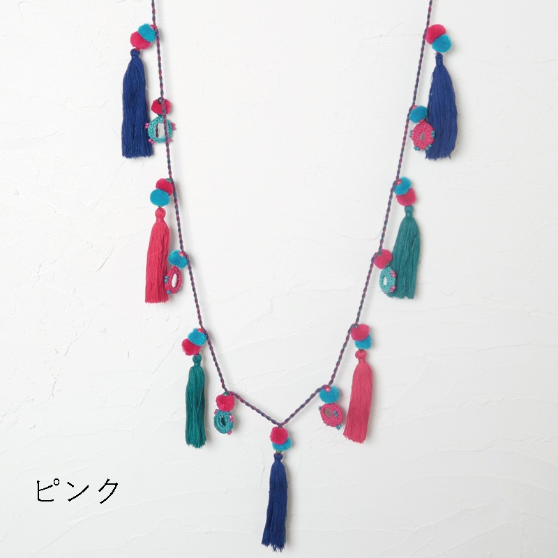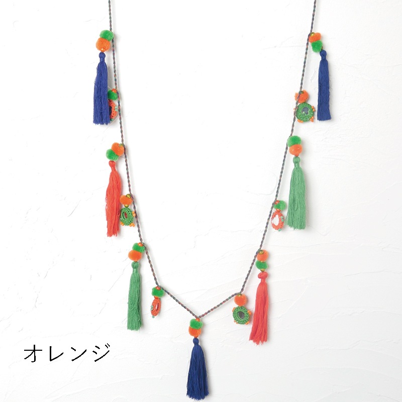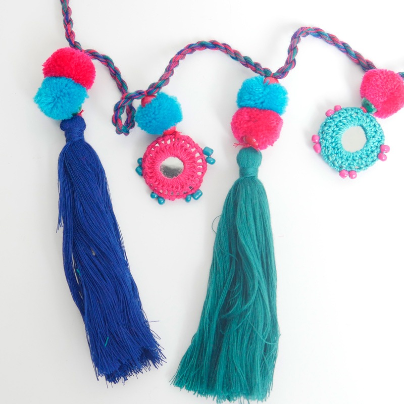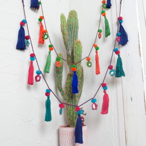 目を引くビビットカラーの配色をベースに、飾りのミラーワークやボリューミーなタッセルのバランスが可愛い。インテリアとしてそのまま飾ったり、コード部分に写真やポストカードを挟んで飾ると、また違った雰囲気になるのでオススメ。