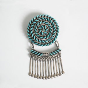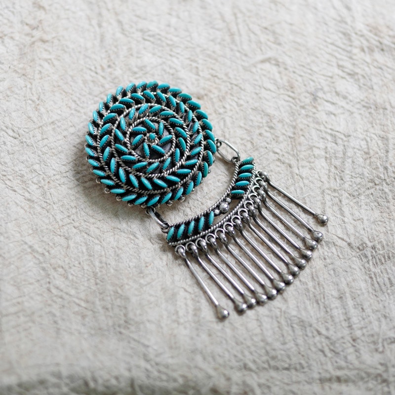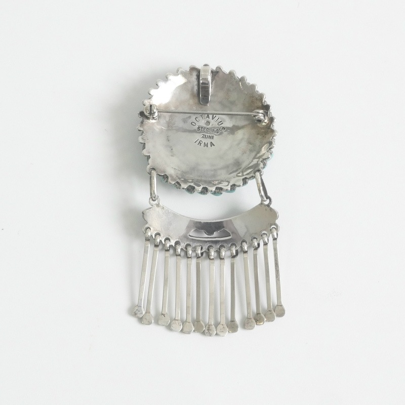 Irma&Octavius Seowtewaの滑らかな細工が美しい、大きめのペンダントブローチです。Zuniで1920年ごろから作り始められたニードルポイントジュエリー。現在その最高峰ともいわれるのが、このIrma&Octaviusの”スワール(渦)・ジュエリー”です。風車で遊ぶ子供たちを見てインスパイアされたというデザインは、一つ一つの石を妻Irmaが美しい半月状に削り出し、夫Octaviusの繊細なシルバーにはめ込んでゆきます。全て緻密で均一に仕上げられた美しいターコイズの渦。素朴な村の工芸品をハイ・ジュエリーの域へと高めた大変美しいペンダントです。