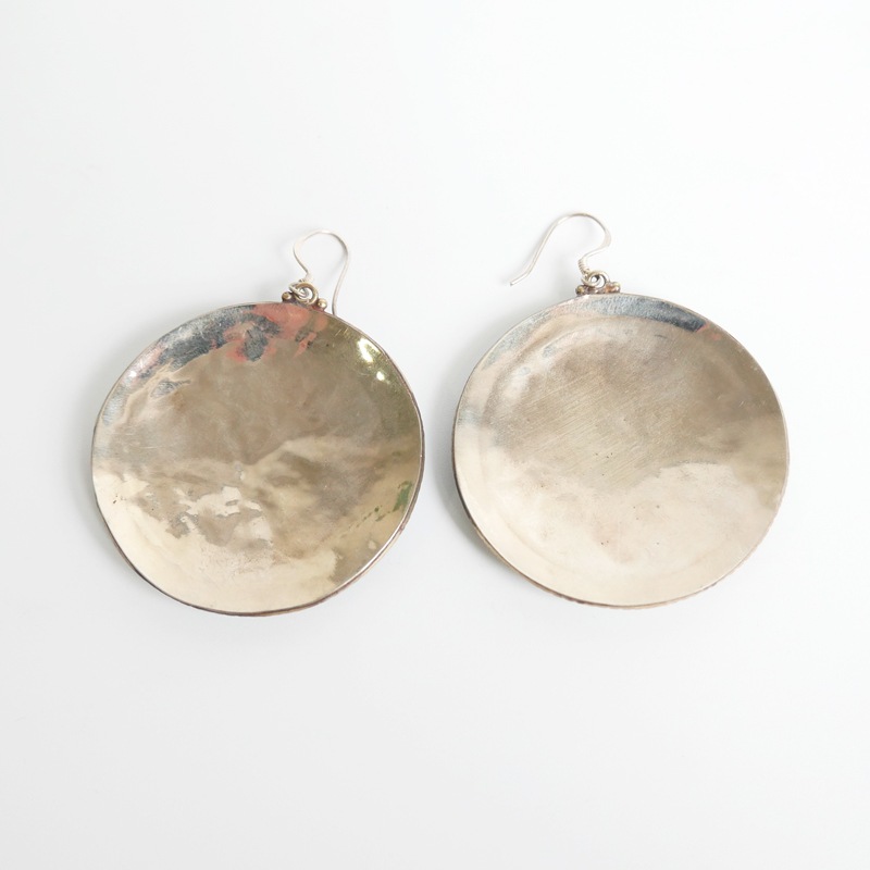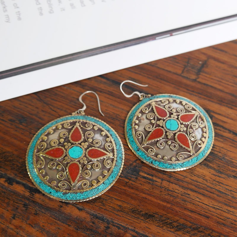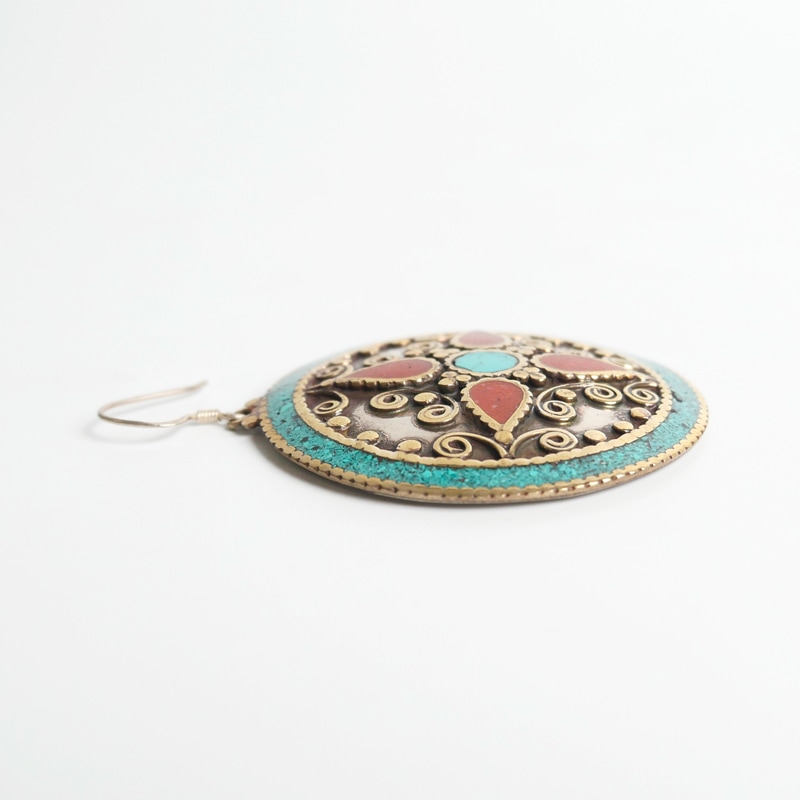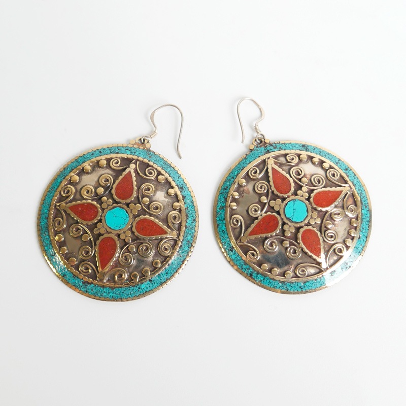 中東から中国にかけてのかつての交易路「シルクロード」の影響を受けて発展したデザインを取り入れたシルクロードアクセサリー。ラウンド型のプレートに細かい装飾やターコイズ、コーラルなどを組み合わせたピアス。ひときわ目立つその存在感で、お顔回りを華やかに見せてくれる。デイリースタイルに取り入れておしゃれが楽しめます。