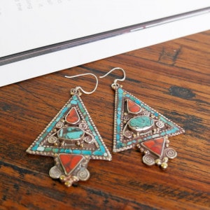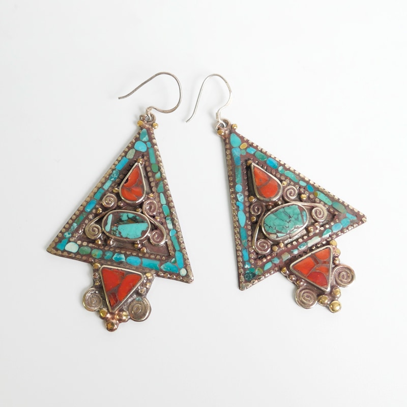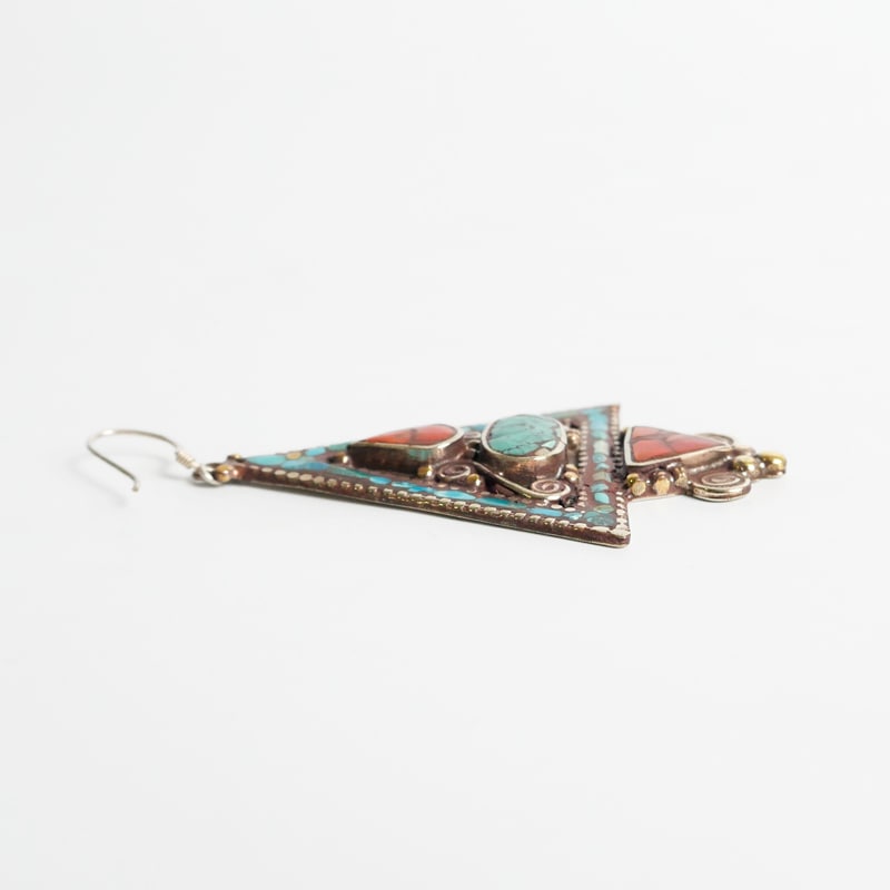 中東から中国にかけてのかつての交易路「シルクロード」の影響を受けて発展したデザインを取り入れたシルクロードアクセサリー。エキゾチックな雰囲気あふれるトライアングル型。細かい装飾やターコイズ、コーラルなどを組み合わせたピアス。ひときわ目立つその存在感で、お顔回りを華やかに見せてくれる。デイリースタイルに取り入れておしゃれが楽しめます。