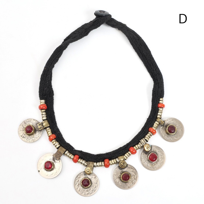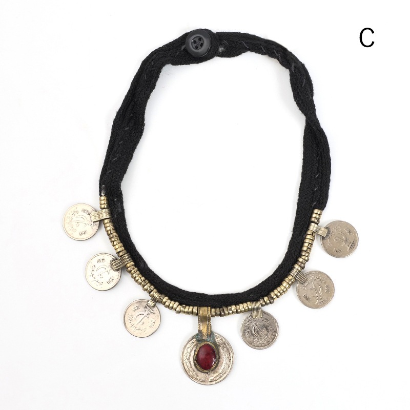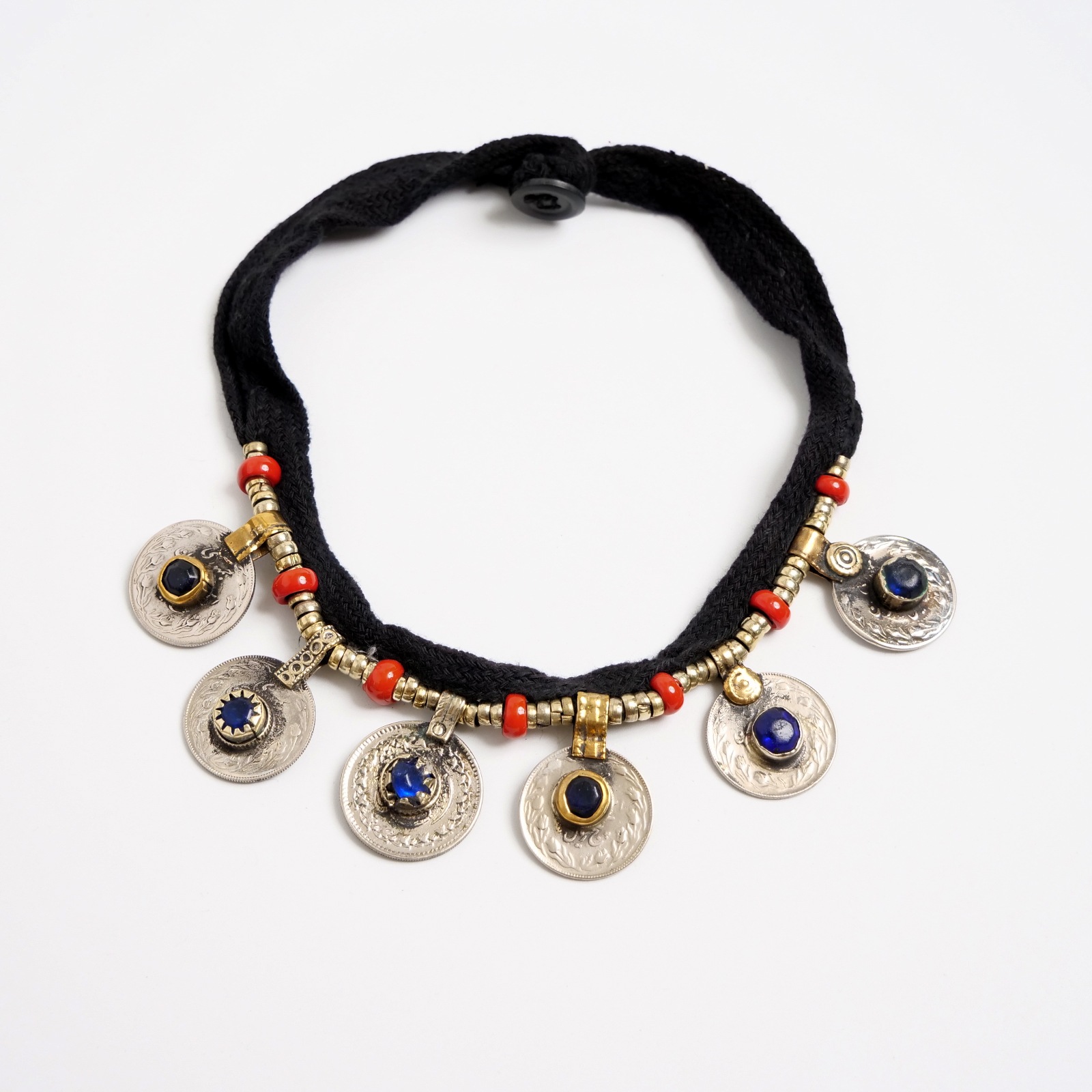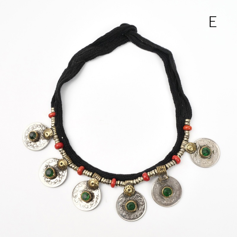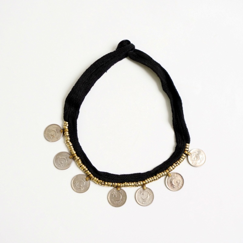 本物のコインを使用した雰囲気あるネックレスです。アフガニやパキスタンルピー・イランリヤル等の旧硬貨をそのままアクセサリーに加工したもので、コインを装飾として使用する中東の遊牧民を想起させるノマドなアクセサリー。宝石のように嵌めこまれたカラーガラスもポイントに。短めのチョーカースタイルなので他のネックレスとの重ねづけにもおすすめ。