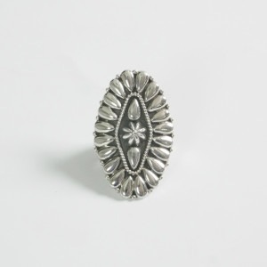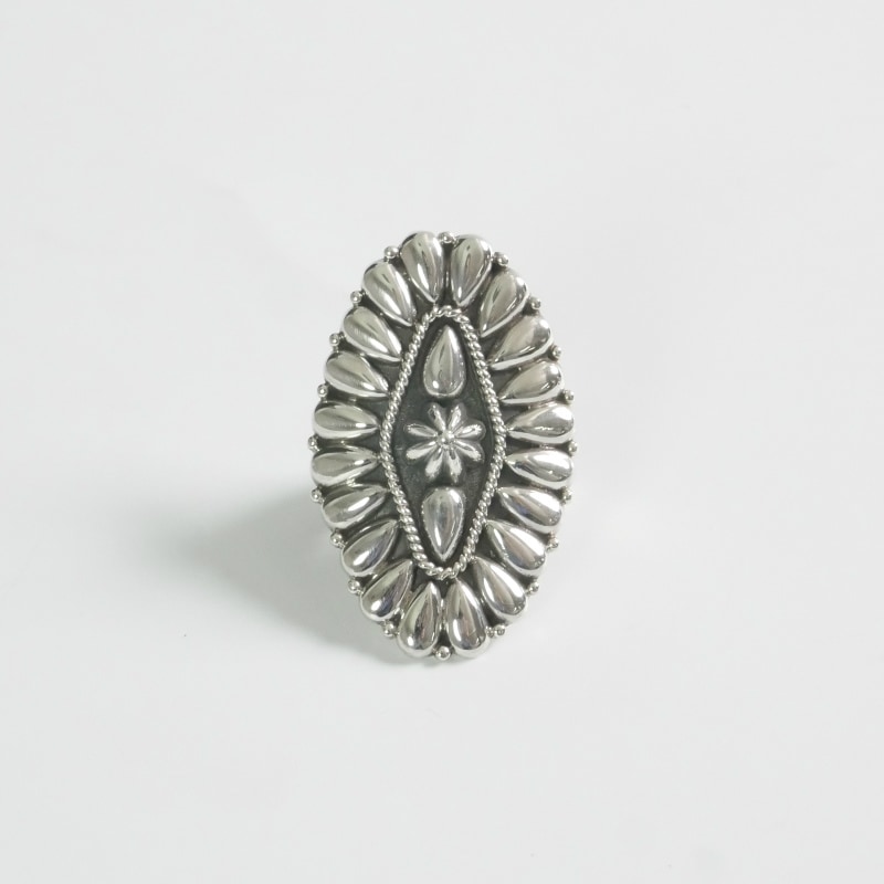 トーマスジムのシックなシルバークラスターリングです。通常はターコイズなどの石で作るクラスタージュエリーをシルバーで再現しています。パーツを一粒一粒作って薄いシルバーに貼り付け、切り出すという大変手間をかけた手法で作られていて、大人の個性派ジュエリーらしい重厚さと華やかさです。