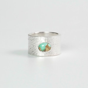 ダリルビゲイのロイストンリングです。トゥファストーン質感のシルバーに、森と土を思わせるナチュラルな色味のロイストンターコイズをひとつあしらった作品。シンプルなシャンクが背景となり石の美しさをより引き立てています。