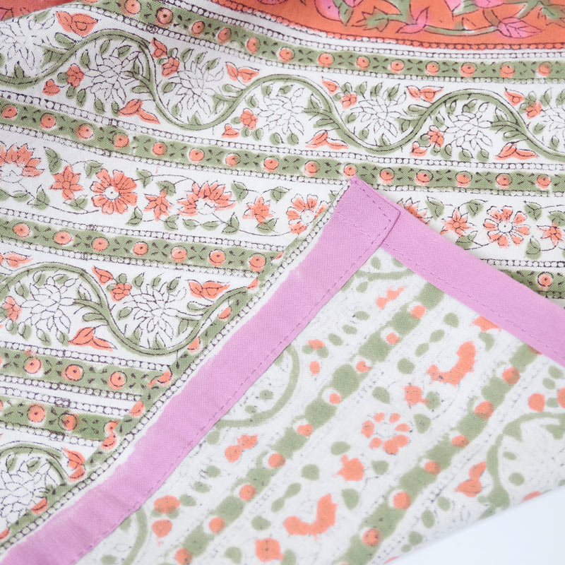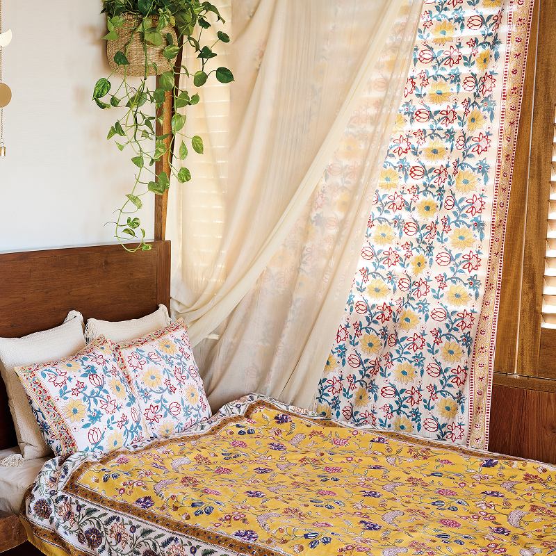 ラジャスタン州の町「サンガネール」ブロックプリントのベッドカバー。木版で何度も重ねたカラフルな花々や植物は、ハンドメイドならではのにじみ・かすれが魅力。同シリーズのクッションカバーと合わせてのコーディネートがおススメ。