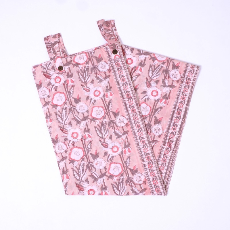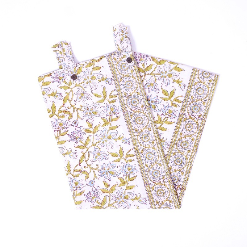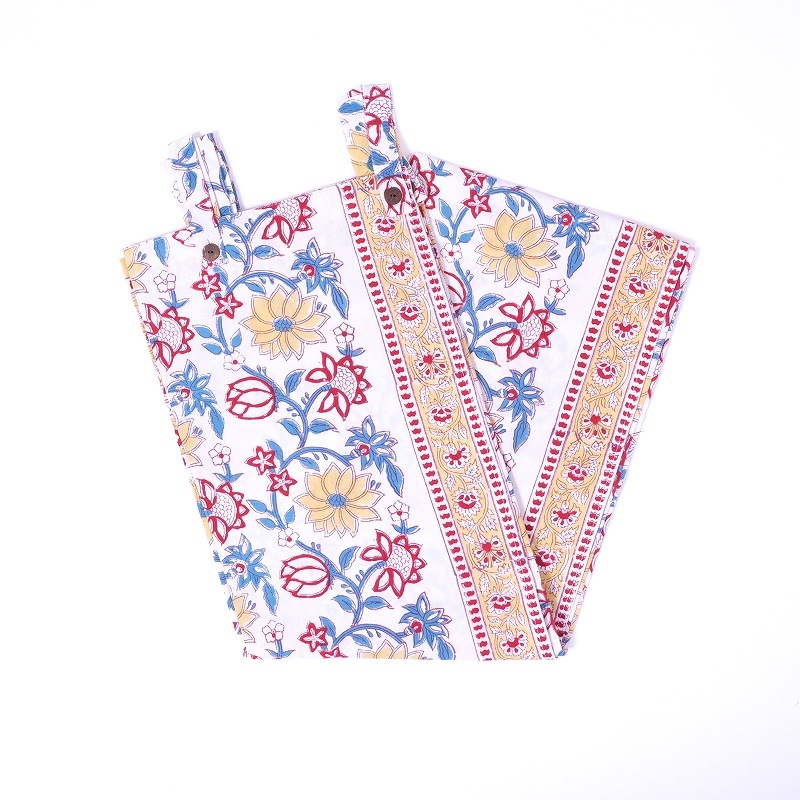 木版に手彫りで版を作り、スタンプの要領で一版一色ずつ押して柄を作っていく、世界のプリント技法にも影響を与えているインドの伝統技法です。使われている色の数だけ作業の工程が増え、手間と時間が惜しみなく掛けられます。ブロックプリントに見られるかすれやにじみ、柄のずれには、インドの手仕事の温かみが現れています。