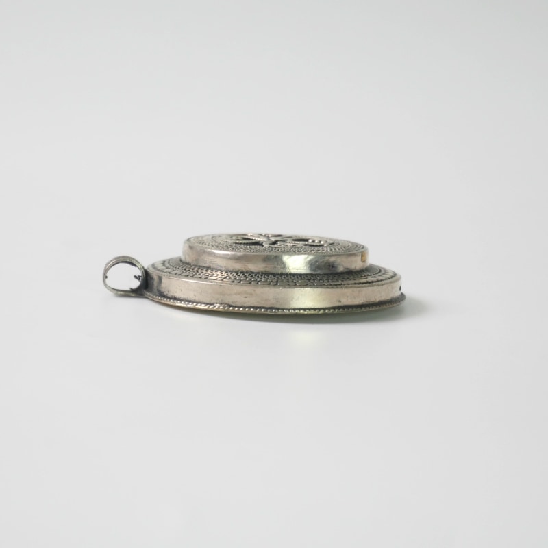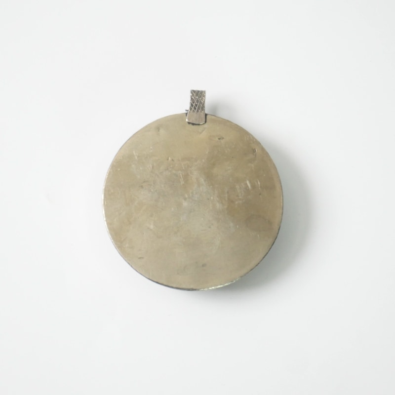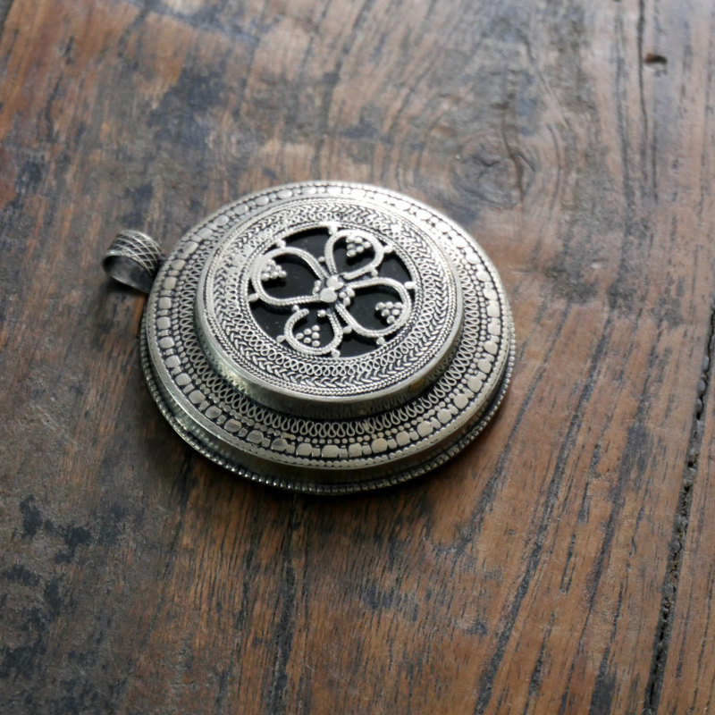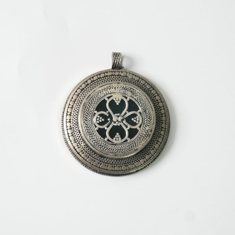 アフガニスタン近郊で作られたオールドペンダントです。トルクメン系のデザインで、繊細なワイヤー柄が組み合わされたレース細工のような模様が魅力。サークル型の透かしの中には艶やかなブラックのガラスが嵌めこまれ、ヴィンテージな雰囲気たっぷり。レザーコードなどに通してお楽しみください。